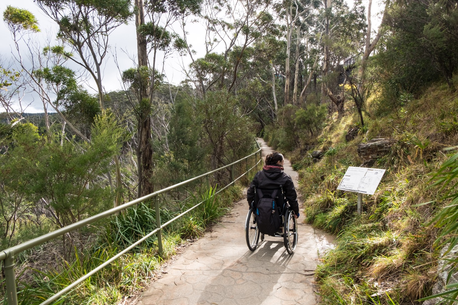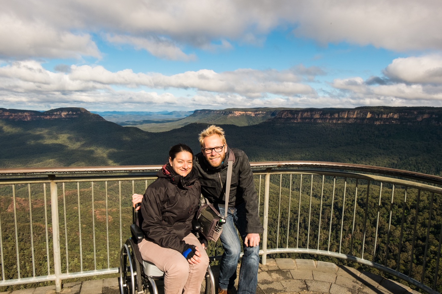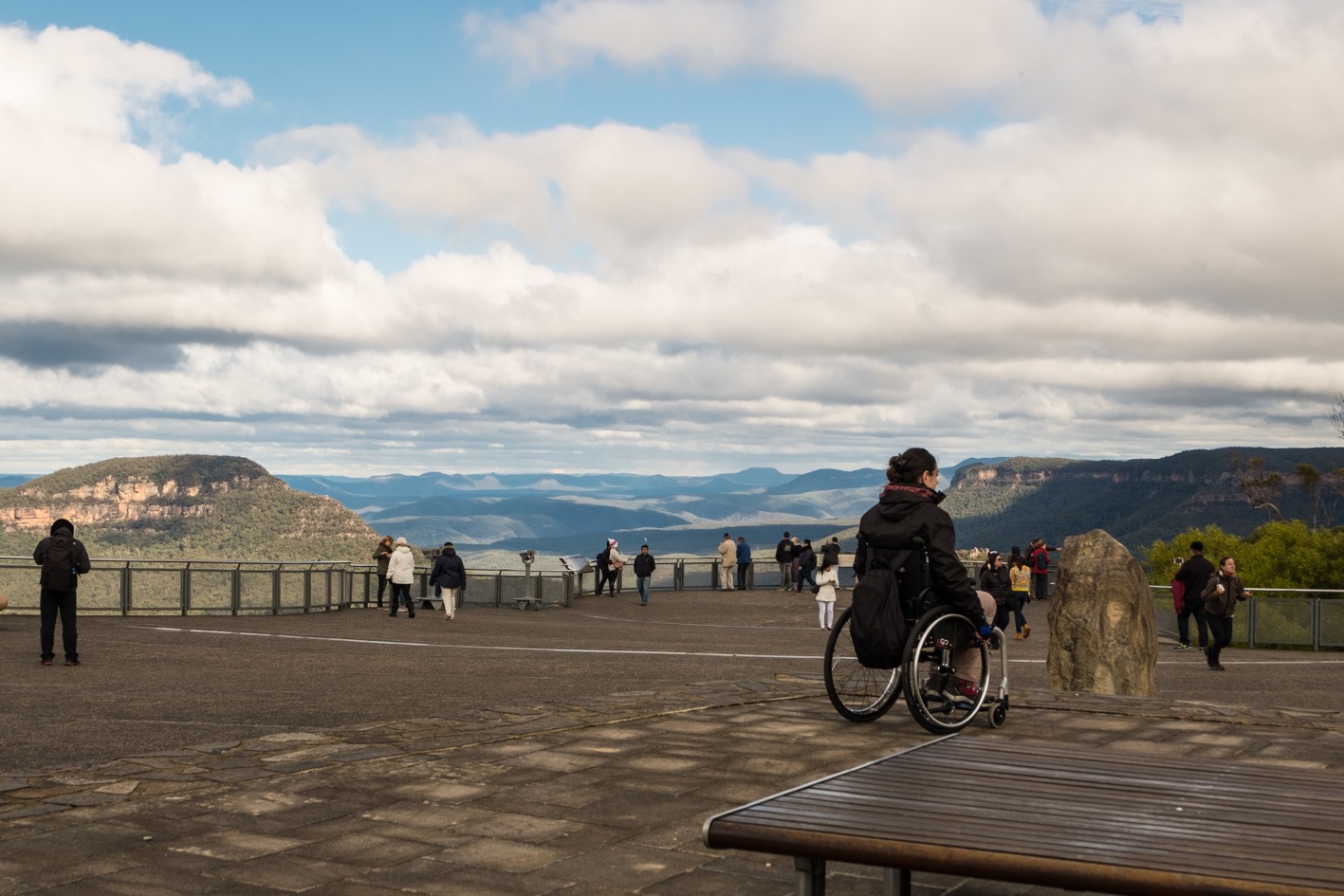 A notre arrivée à la gare de Katoomba, nous nous rendons directement à l’office du tourisme pour connaitre les possibilités qui s’offrent à nous, tout en tenant compte de mon handicap. Il existe une formule à 83 dollars qui comprend l’accès au bus touristique et aux attractions « scenic world » à savoir le skyway, le cableway et le railway. Le skyway et le cableway sont des grandes cabines vitrées. La première survole les gorges des blue mountains à une hauteur de 270 mètres et a une partie de son sol en verre. La deuxième permet de se rendre vers une marche, la walkway, tout en profitant du paysage pendant sa descente assez pentue. Elles peuvent, toutes les deux, accueillir des fauteuils roulants. Le railway,quant à lui, est une descente en train dans la forêt. Cette descente en train est connue pour être la plus raide au monde transportant des passagers. Malheureusement, elle n’est pas accessible aux fauteuils roulants. Le bus touristique n’est pas accessible non plus. La personne du site d’informations nous propose donc de prendre une formule à 83 dollars pour Franck et une à 39 dollars pour moi qui me fait bénéficier des accès à scenic world mais pas au bus touristique. C’est un geste commercial : ainsi je n’aurai pas à payer le bus dans lequel je ne peux pas monter en fauteuil roulant mais que je peux emprunter en sortant de ce dernier. Finalement, cette personne nous avoue à demi-mots que le bus de la ville est, en revanche, accessible et permet de se rendre au mêmes endroits. On opte donc pour deux forfaits à 39 dollars et nous prendrons le bus « classique ». En plus, nous avons fait de sérieuses économies : nous avons seulement dépensé 14 dollars de bus à deux pour la journée alors que cela nous aurait couté 66 dollars en prenant les forfaits complets. Je conseille donc à tout le monde d’opter pour cette solution si vous visitez les blue mountains à Katoomba.