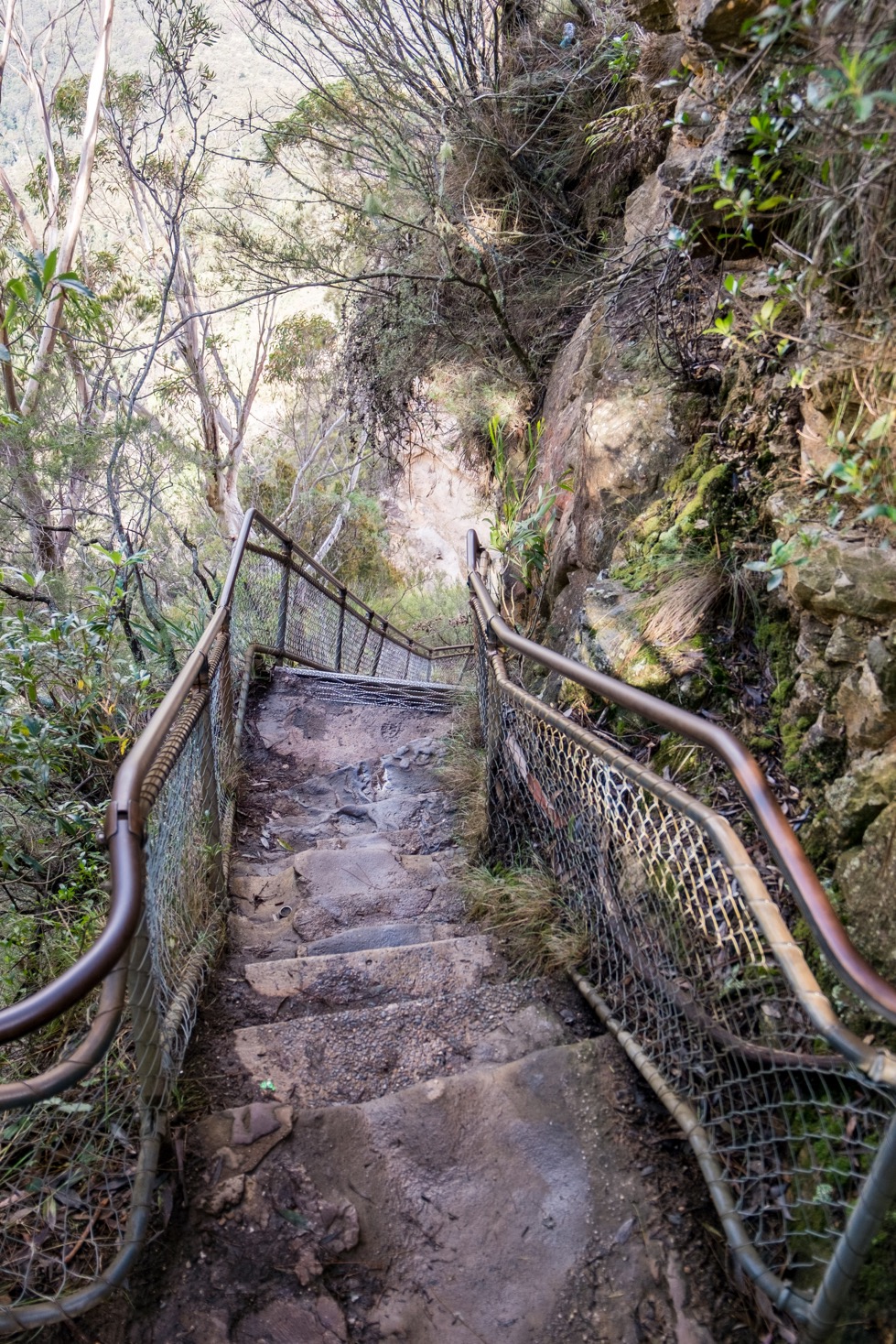Nous descendons un peu dans la végétation pour faire une petite promenade plus près du bord des falaises avant de revenir à echo point car Franck veut aller au pied des three sisters. Le chemin qui y amène se termine par une série d’escaliers très pentus et irréguliers, qui a donné à Franck de sérieux vertiges.