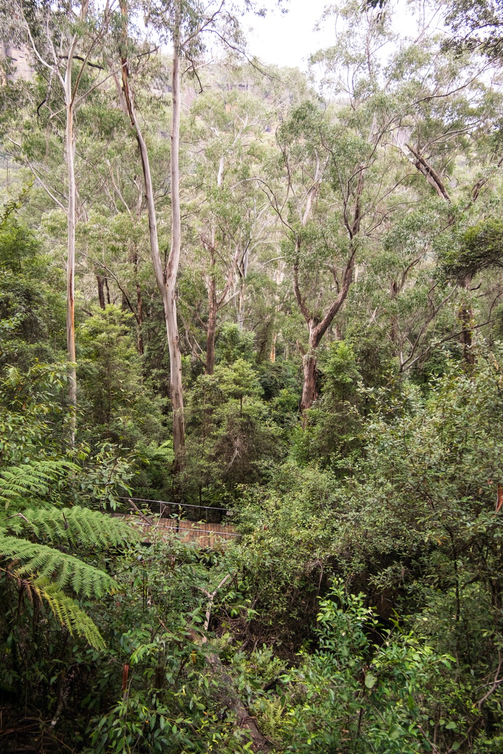 De mon côté, je me rends à la boutique, qui fait aussi point d’informations, où je récupère une liste de tous les lieux des blue mountains qui sont accessibles que se soient les marches à pied, les magasins, les restaurants ou encore les sanitaires. Il est déjà midi passé. Nous mangeons notre déjeuner sur le pouce et filons en bus vers le skyway. La traversée au dessus des gorges et de la forêt est superbe. J’en aurai bien profité plus longtemps mais en quelques minutes nous sommes déjà arrivés de l’autre côté. Avides d’une nouvelle vision de ce décor, nous enchainons directement avec le cableway. Pas de sol vitré cette fois mais nous sommes tout devant pour bien apprécier la descente inclinée vers la forêt dans laquelle nous pourrons nous promener sur la walkway.