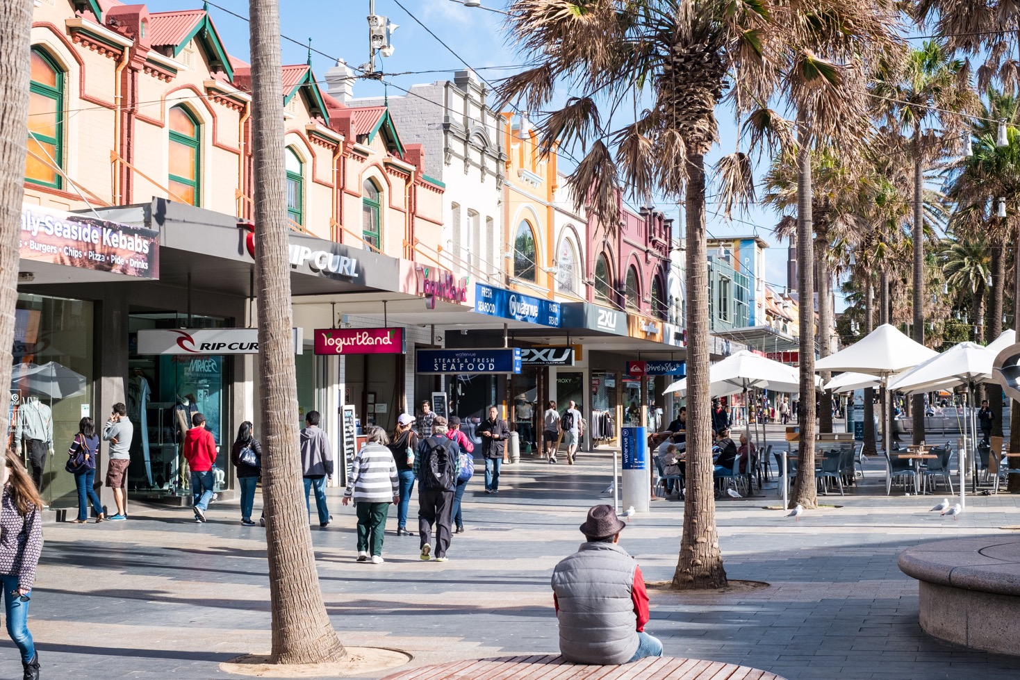 Une demie-heure de ferry plus plus tard, nous sommes à Manly. Je comprends vite pourquoi ce quartier est tant apprécié : de belles plages, de bonnes vagues pour les surfeurs, de nombreux commerces, cafés et restaurants pour se détendre. J’ai même failli me baigner malgré que se soit l’hiver.