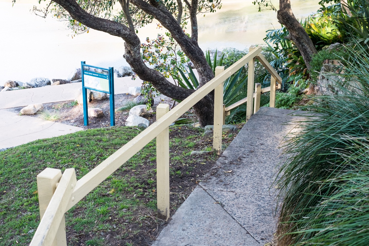 Les premières marches apparaissent rapidement. Il n’y en a que quelques-unes et il y a une rampe donc je les descends à pied et poursuis mon chemin à fauteuil pendant plusieurs centaines de mètres. A ce stade la balade s’arrête déjà pour les personnes ne pouvant pas du tout marcher. Je leur conseille donc de faire seulement la premiere partie s’étalant sur 1,5 kilomètres. Sinon, d’après l’office du tourisme, il en existe une en direction de l’est (nous sommes partis vers l’ouest) qui est plus accessible, du moins une bonne partie.