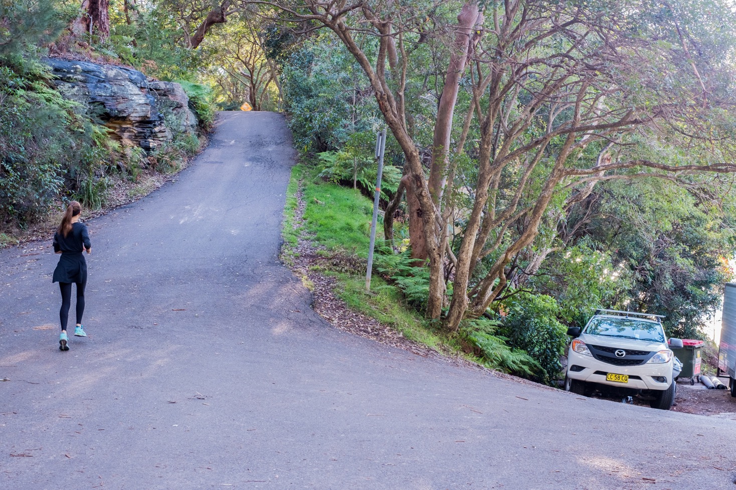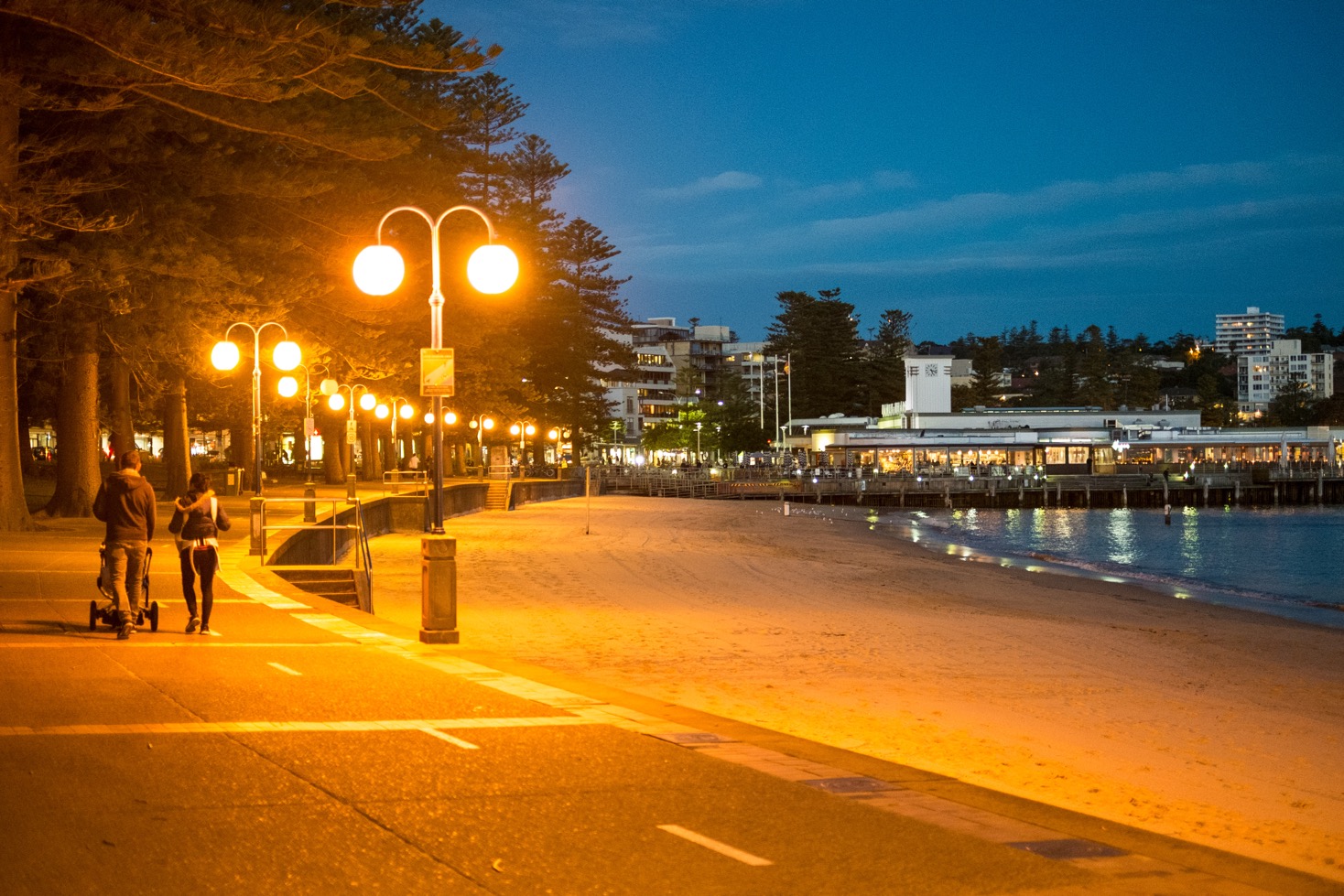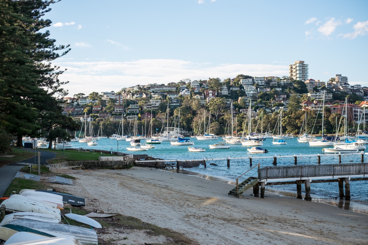 Je décide de quitter temporairement la « manly scenic walk », de traverser la ville et de récupérer le trajet de l’autre côté de celle-ci. Finalement, je n’ai jamais pu regagner le parcours de la marche. La portion de ville que nous devions traverser faisait plusieurs kilomètres mais je ne m’en étais pas rendue compte. Les rues sont toutes extrêmement pentues. Franck est obligé de me pousser dans les montées et de me retenir dans les descentes. Cela lui demande beaucoup d’efforts et nous sommes toujours très loin du tracé de la randonnée. Le soleil se couche. J’en ai marre. A ce moment là, je pense même à prendre un bus pour rentrer ou à commander un taxi. Pas de bus dans les parages et impossible d’appeler un taxi car nous n’avons pas de ligne téléphonique en Australie… Franck parvient à me remonter le moral et nous décidons de rejoindre une partie de la marche par laquelle nous sommes venus et de rentrer. Je vais mieux, nous rentrons donc tranquillement au port de Manly en repassant devant ces magnifiques plages et demeures. Quelle sacrée journée !