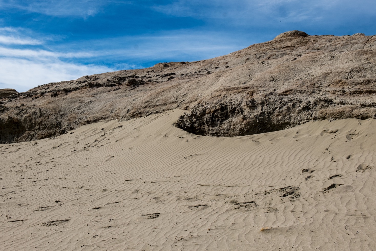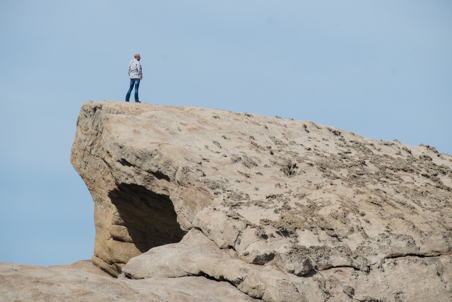 Entre la lagon et le phare il y a toute une étendue rocheuse qui est comme posée sur les dunes. Sa forme et l’aspect du sol nous intrigue un peu alors Franck décide d’aller voir ça de plus près. Dès qu’il voit une colline, un volcan ou monticule à l’aspect un peu original il adore grimper jusqu’au sommet alors il n’allait pas rater une occasion de le faire même si ce n’est pas très haut.