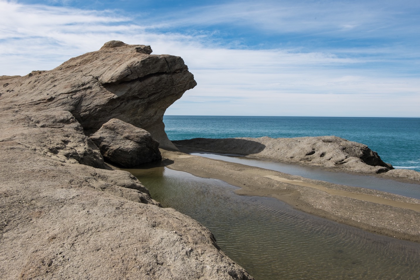 Si vous voulez atteindre l’extrémité de la presqu’ile et avoir la meilleure vue en hauteur il faudra continuer après le phare mais cela n’est pas possible en fauteuil car le seul accès se fait par des escaliers. Ceci dit j’avais déjà une belle vue d’où j’étais. Je pouvais admirer les récifs et même découvrir un lagon de l’autre coté de l’étendue de sable que venions de traversée ! La vue est vraiment belle, peut-importe de quel côté nous regardons. J’admire une dernière fois la vue puis nous sommes redescendus pour nous diriger en direction du lagon. Finalement nous avons surtout observer les dunes de sable et les roches aux formes surprenante et à l’aspect inhabituel qui entourent le lagon et mènent au phare. On dirait même qu’une colline s’est fendue en deux.