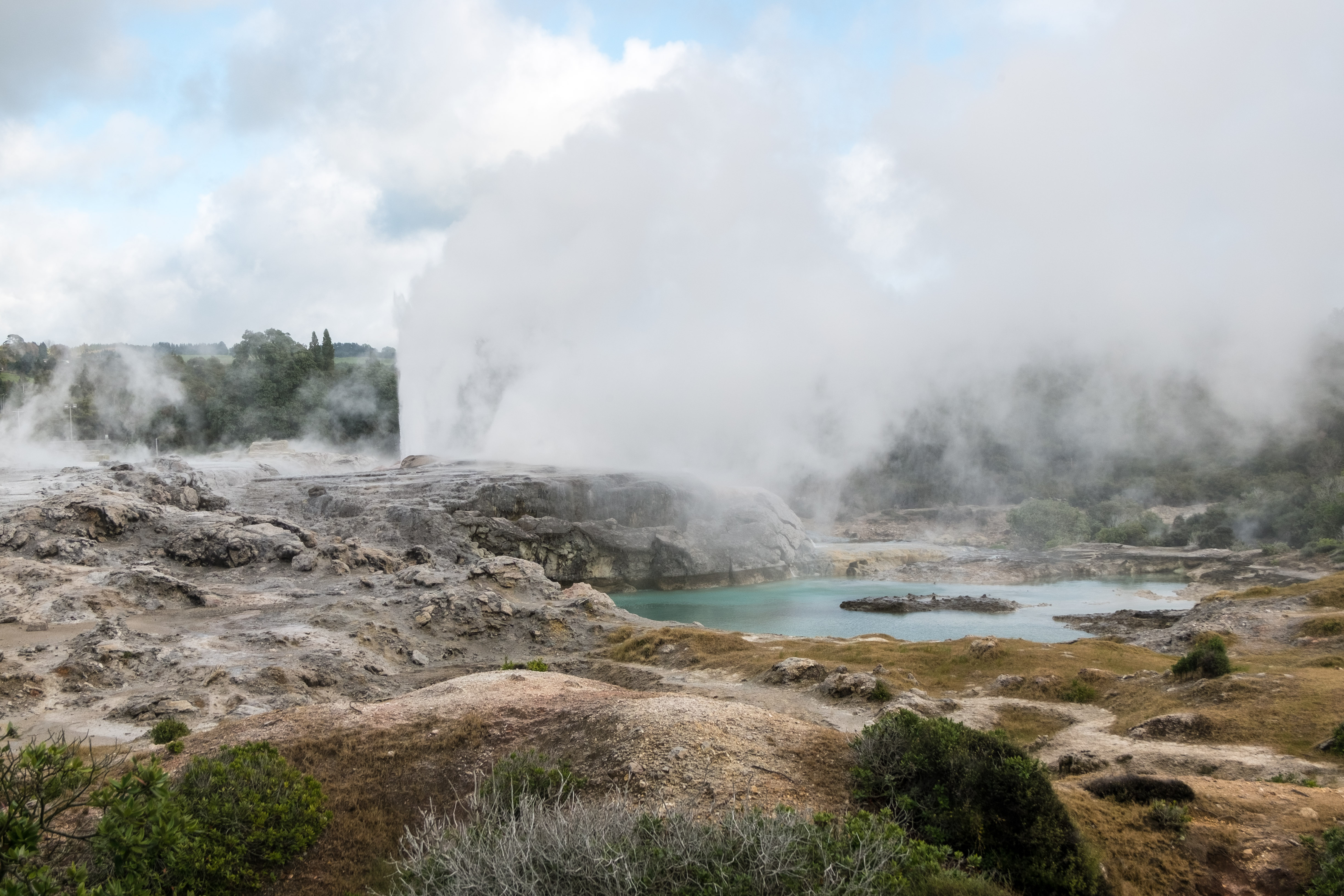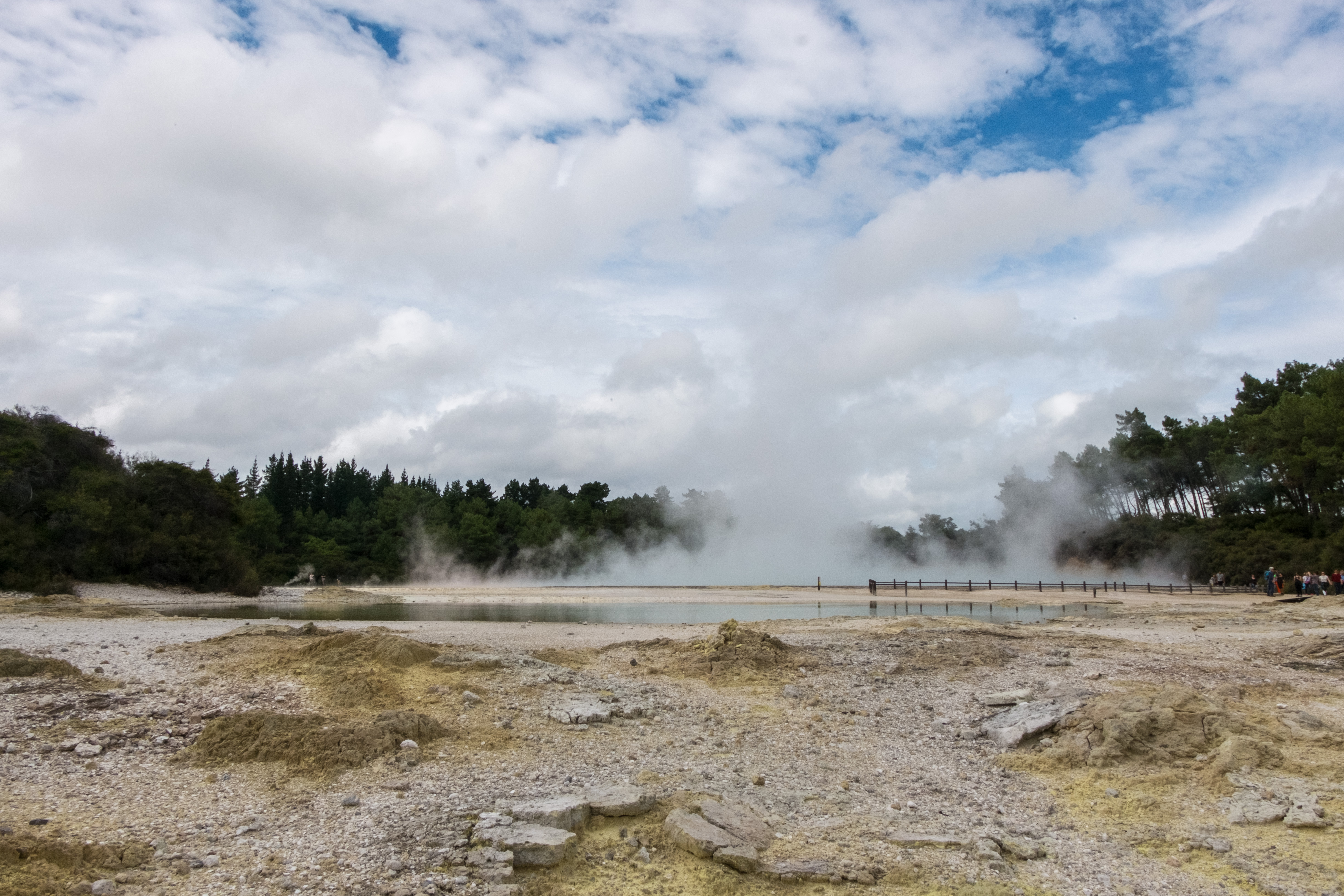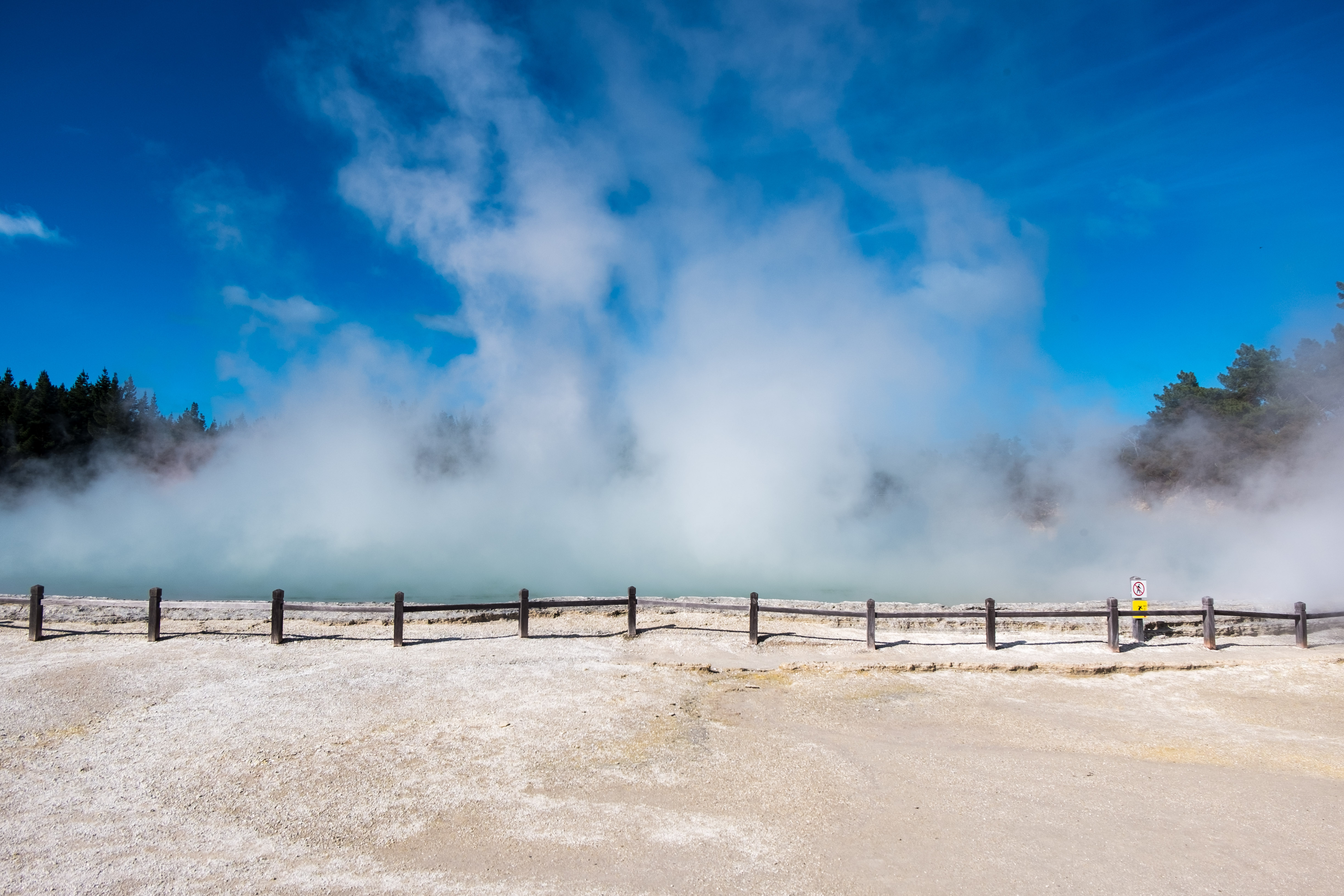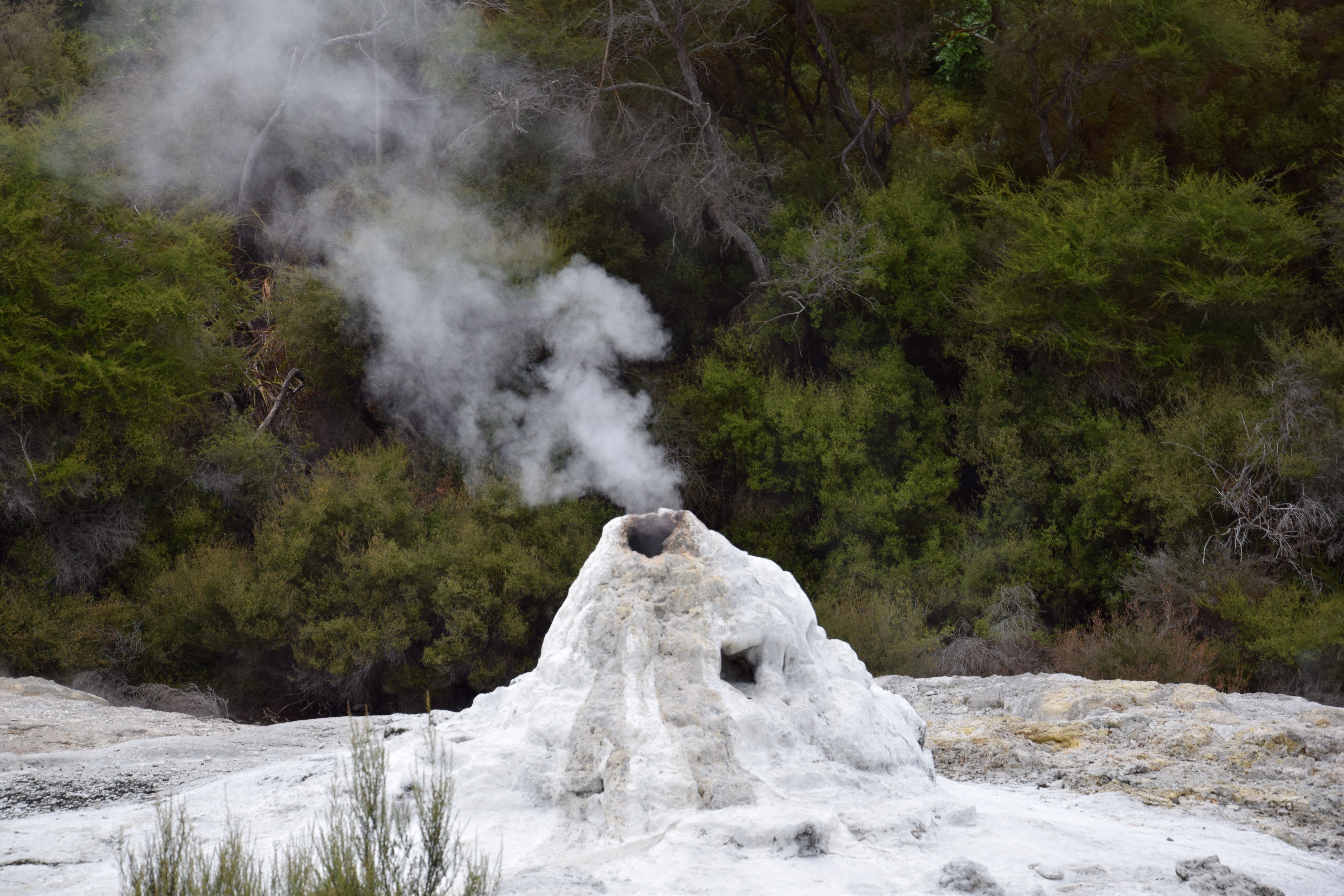 Pour découvrir la géothermie au pays du long nuage blanc rien de mieux que de poser son sac de voyage et ses roulettes à Rotorua. Située au bord du lac du même nom et dans une zone à forte activité géothermique, Rotorua est l’une des villes les plus visitées de Nouvelle-Zélande. De nombreuses activités sont payantes, mais rassurez-vous il suffit de se balader dans la ville pour apercevoir de la géothermie. Le parc Kuirau est gratuit et l’on peut y voir un lac s’étant formé dans un cratère de volcan, des mares de boues bouillonnantes en raison des gaz carboniques remontant à la surface et des sources d’eaux chaudes. On peut même se détendre lors d’un bain de pied dans cette eau. Mais avant même d’avoir vu tout ça c’est l’odeur enveloppant la ville qui m’a étonnée. Cette ville sent l’oeuf pourri ! En réalité elle sent le souffre qui émane de toutes les petites cavités et cratères à travers la ville.
