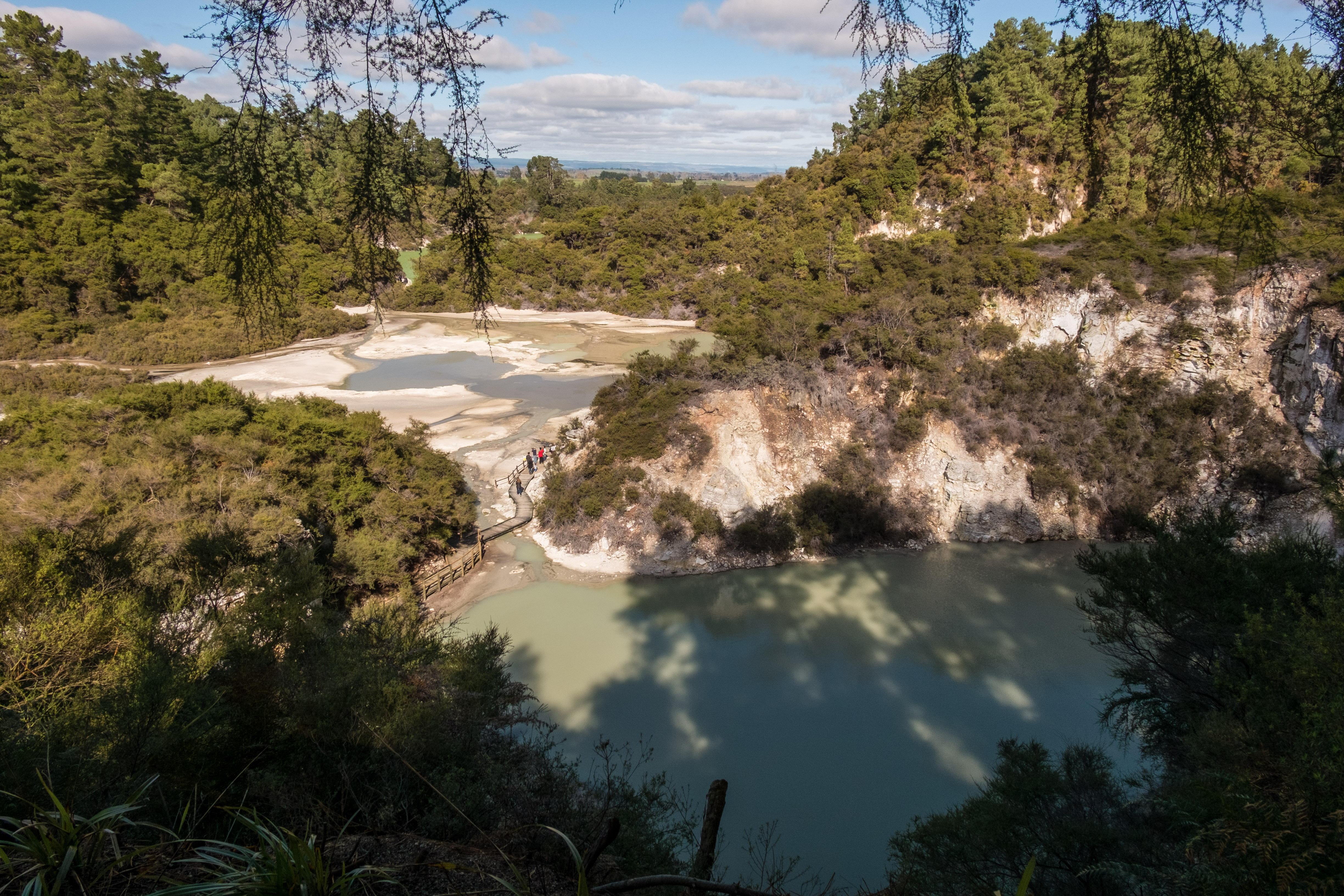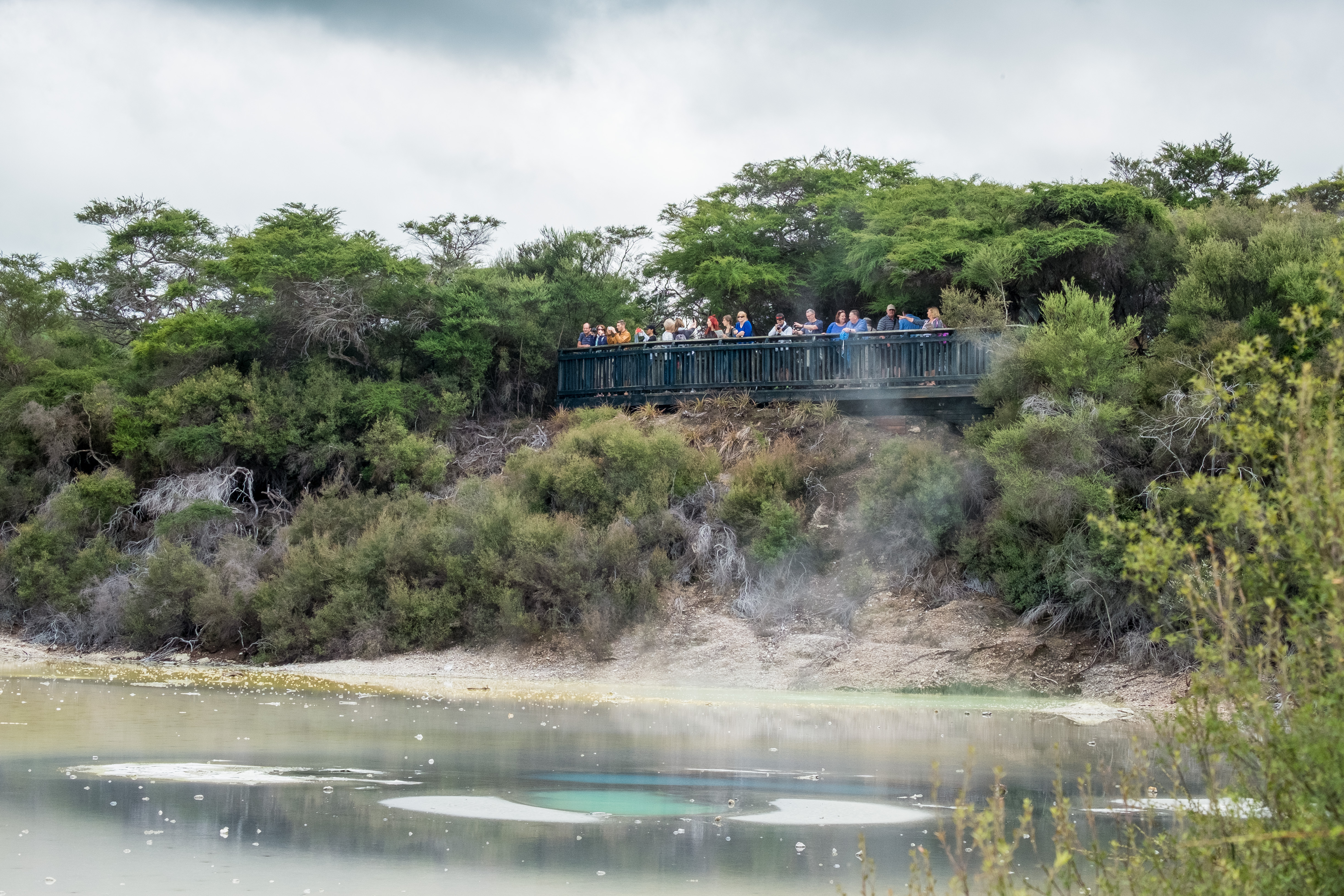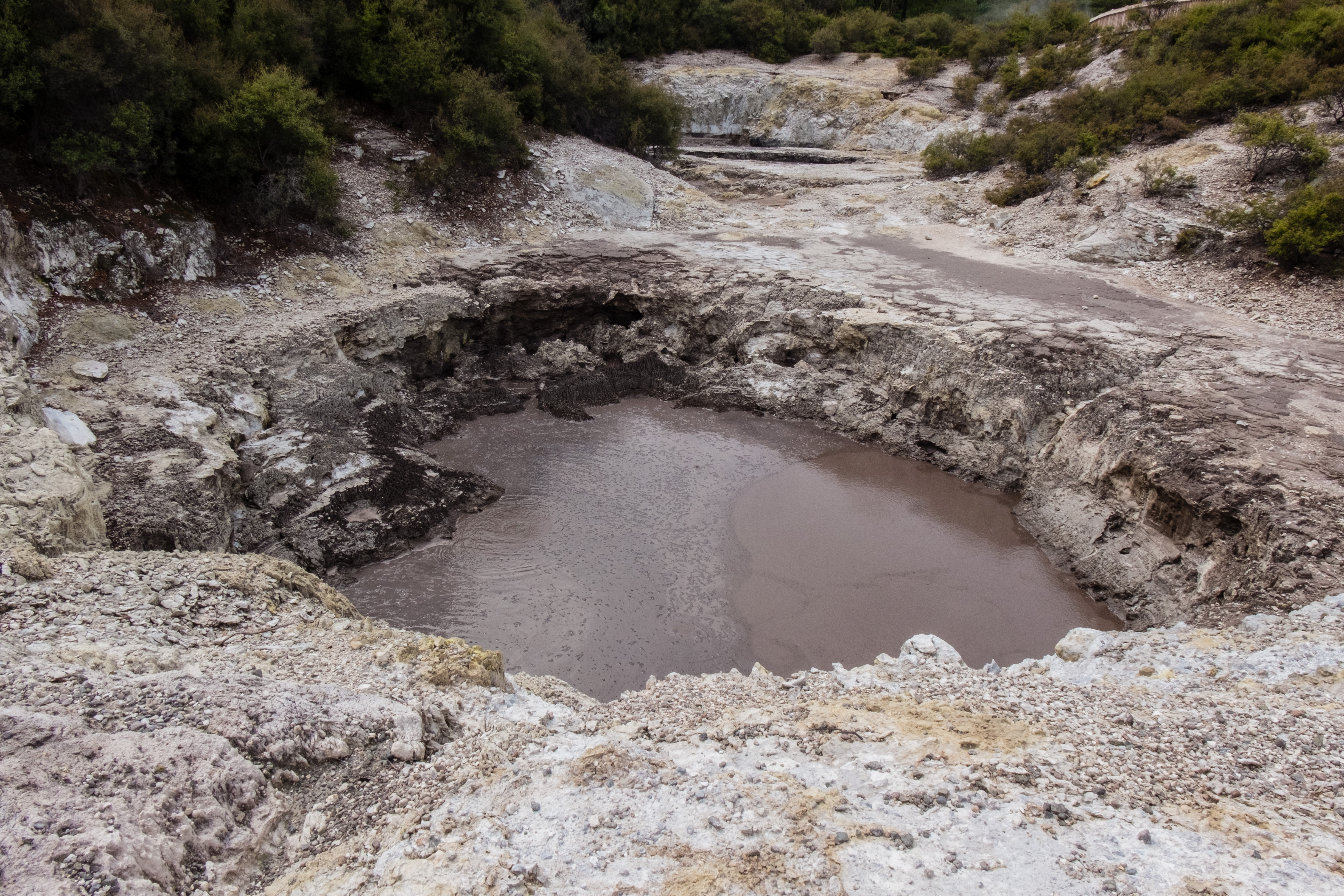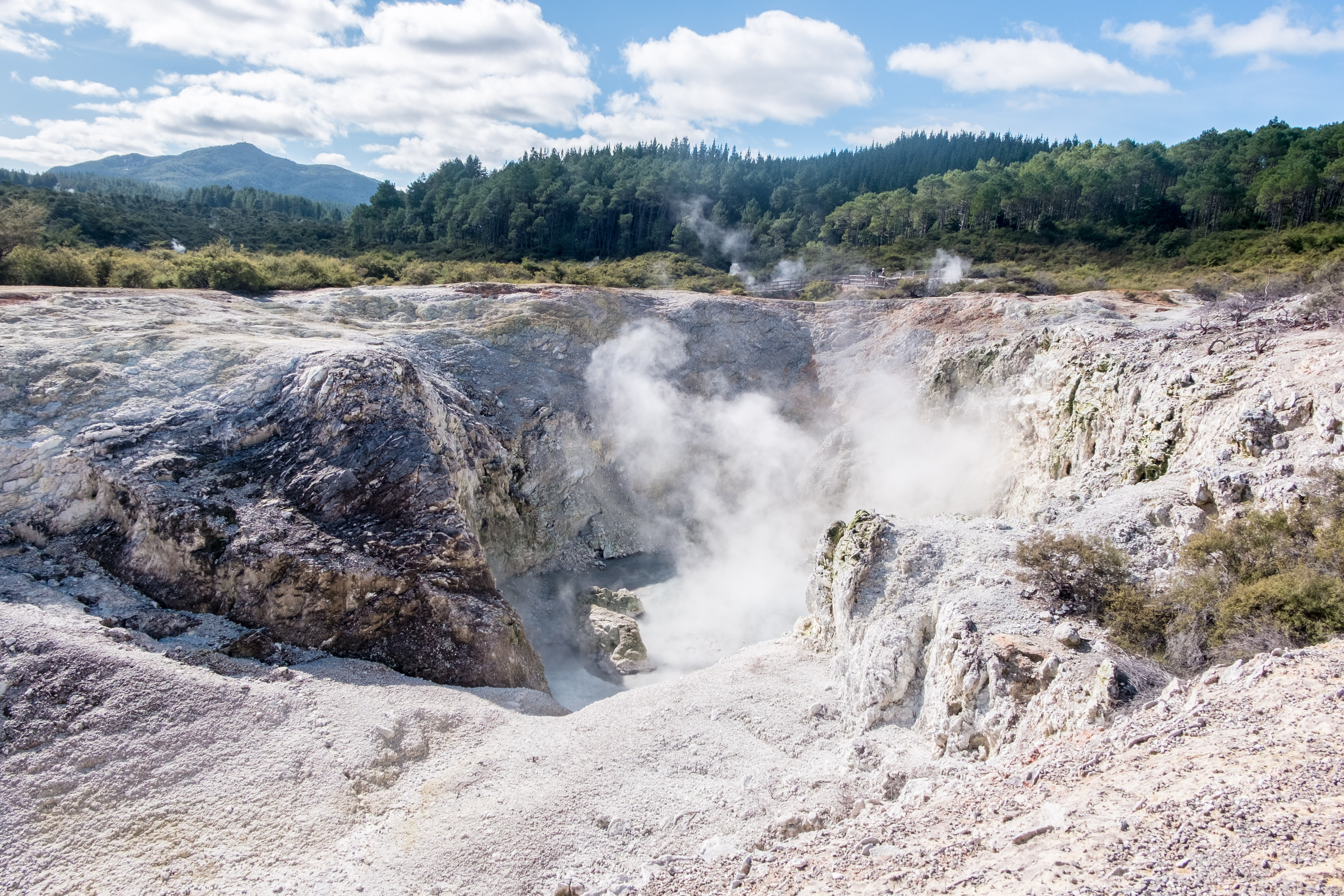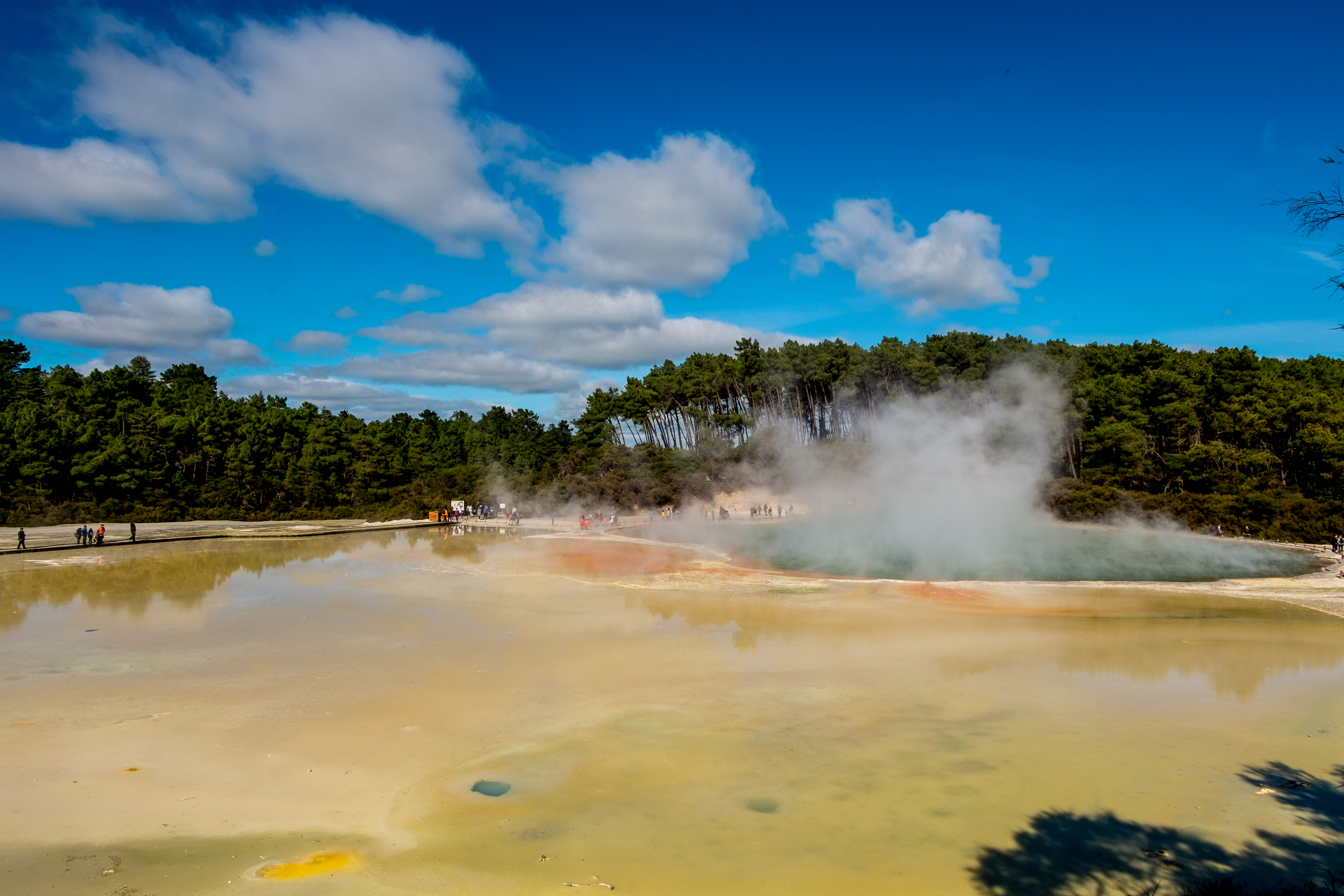 Pour découvrir la géothermie au pays du long nuage blanc rien de mieux que de poser son sac de voyage et ses roulettes à Rotorua. Située au bord du lac du même nom et dans une zone à forte activité géothermique, Rotorua est l’une des villes les plus visitées de Nouvelle-Zélande. De nombreuses activités sont payantes, mais rassurez-vous il suffit de se balader dans la ville pour apercevoir de la géothermie. Le parc Kuirau est gratuit et l’on peut y voir un lac s’étant formé dans un cratère de volcan, des mares de boues bouillonnantes en raison des gaz carboniques remontant à la surface et des sources d’eaux chaudes. On peut même se détendre lors d’un bain de pied dans cette eau. Mais avant même d’avoir vu tout ça c’est l’odeur enveloppant la ville qui m’a étonnée. Cette ville sent l’oeuf pourri ! En réalité elle sent le souffre qui émane de toutes les petites cavités et cratères à travers la ville.