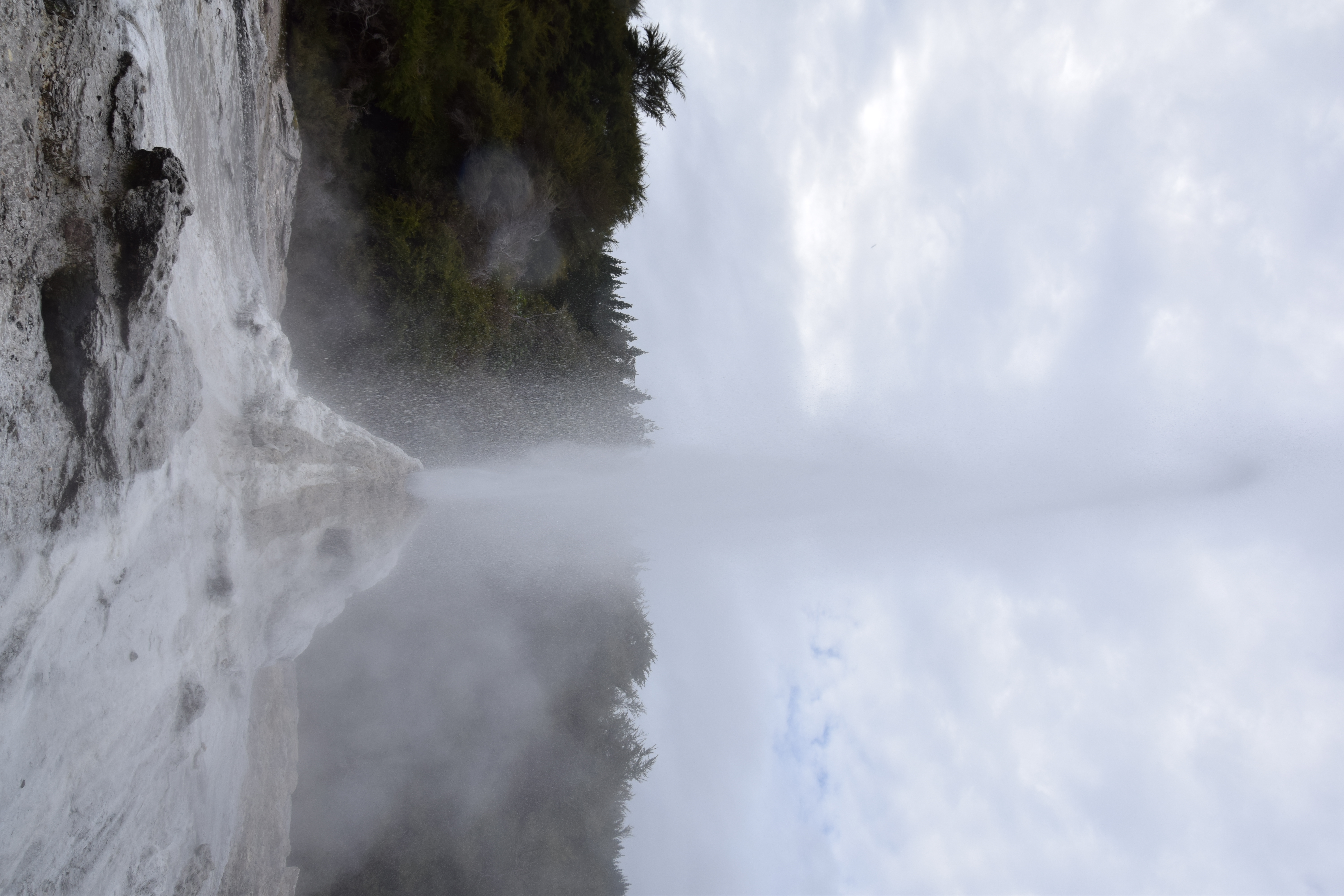 Mais avant de rentrer dans le parc nous sommes allés rendre visite à Lady Knox. Cette Lady est en réalité un geyser qui entre en éruption tous les jours à 10h. Tous les jours à la même heure, il y a de quoi se poser des questions tout de même. Comment se fait t-il qu’un geyser soit si régulier dans ses eruptions ? En réalité on lui donne un petit coup de main en mettant dans sa cheminée des pastilles agissant comme du savon, mais auxquelles ont été retirés tous les éléments chimiques pouvant être nocifs pour la nature. Quelques secondes après avoir renversé ce produit dans la cheminée du geyser, celui-ci rentre peu à peu en éruption. Le jet va atteindre entre 10 et 20 mètres de hauteur et cela peut durer au maximum deux heures. C’est assez impressionnant.
