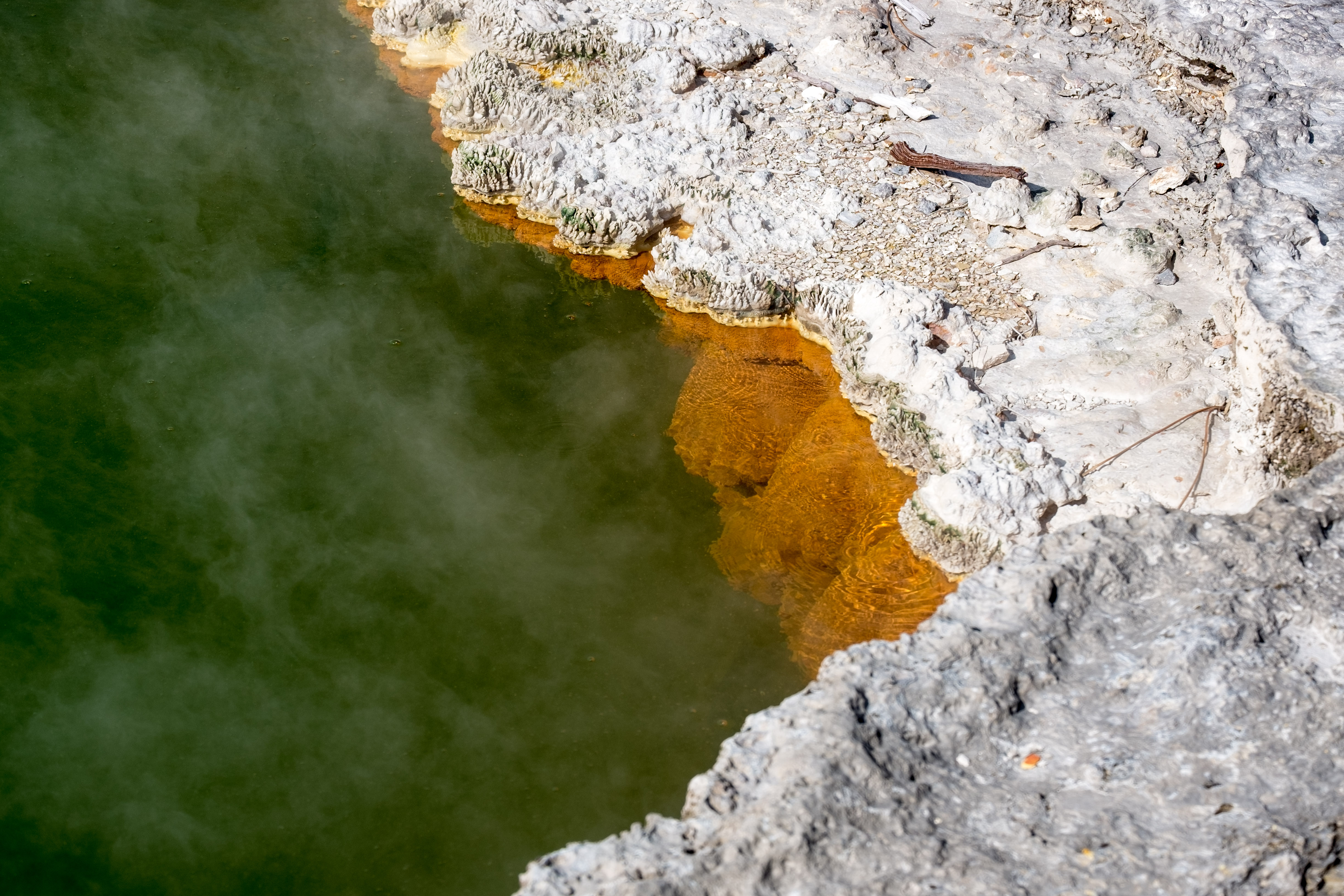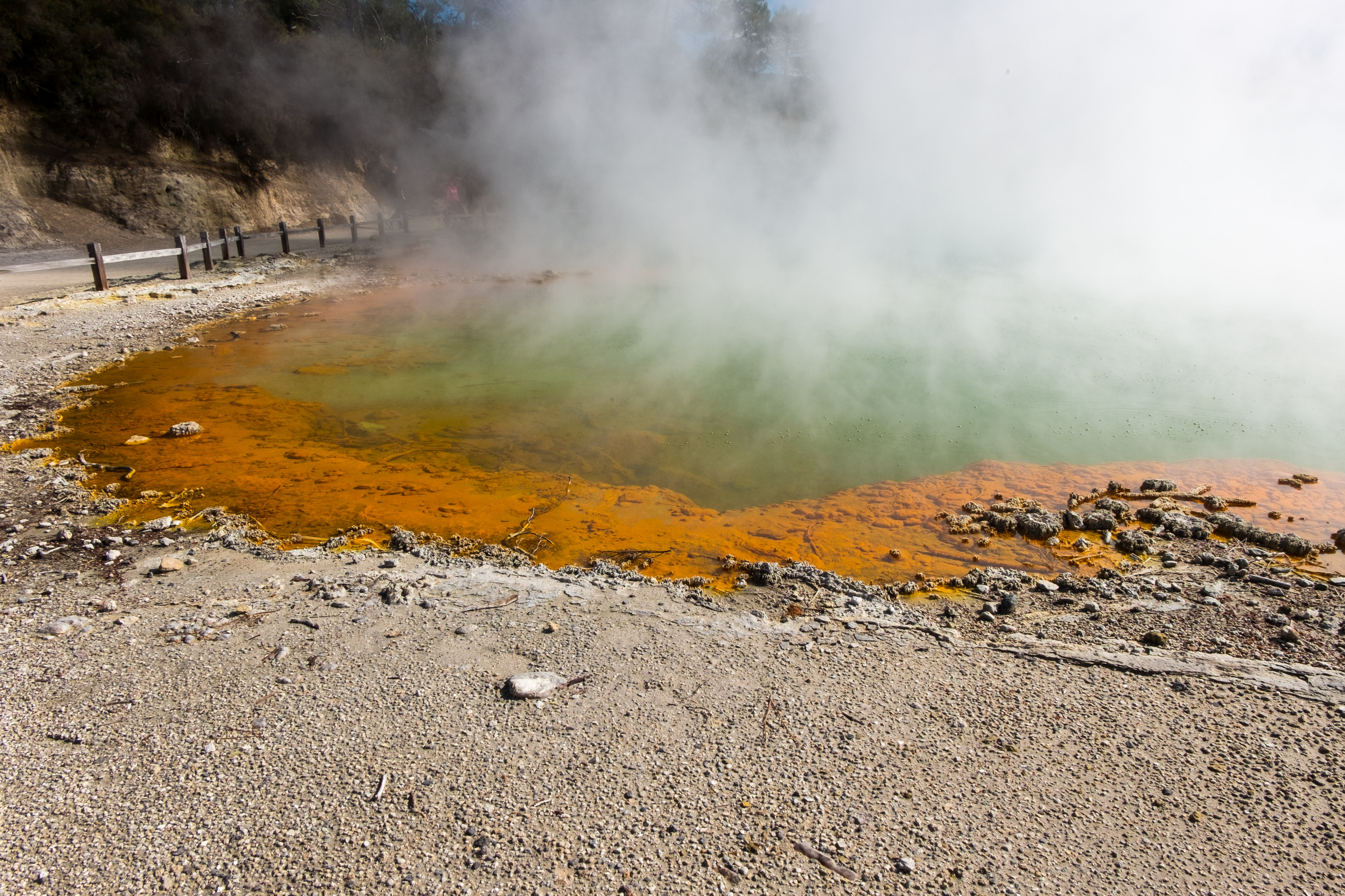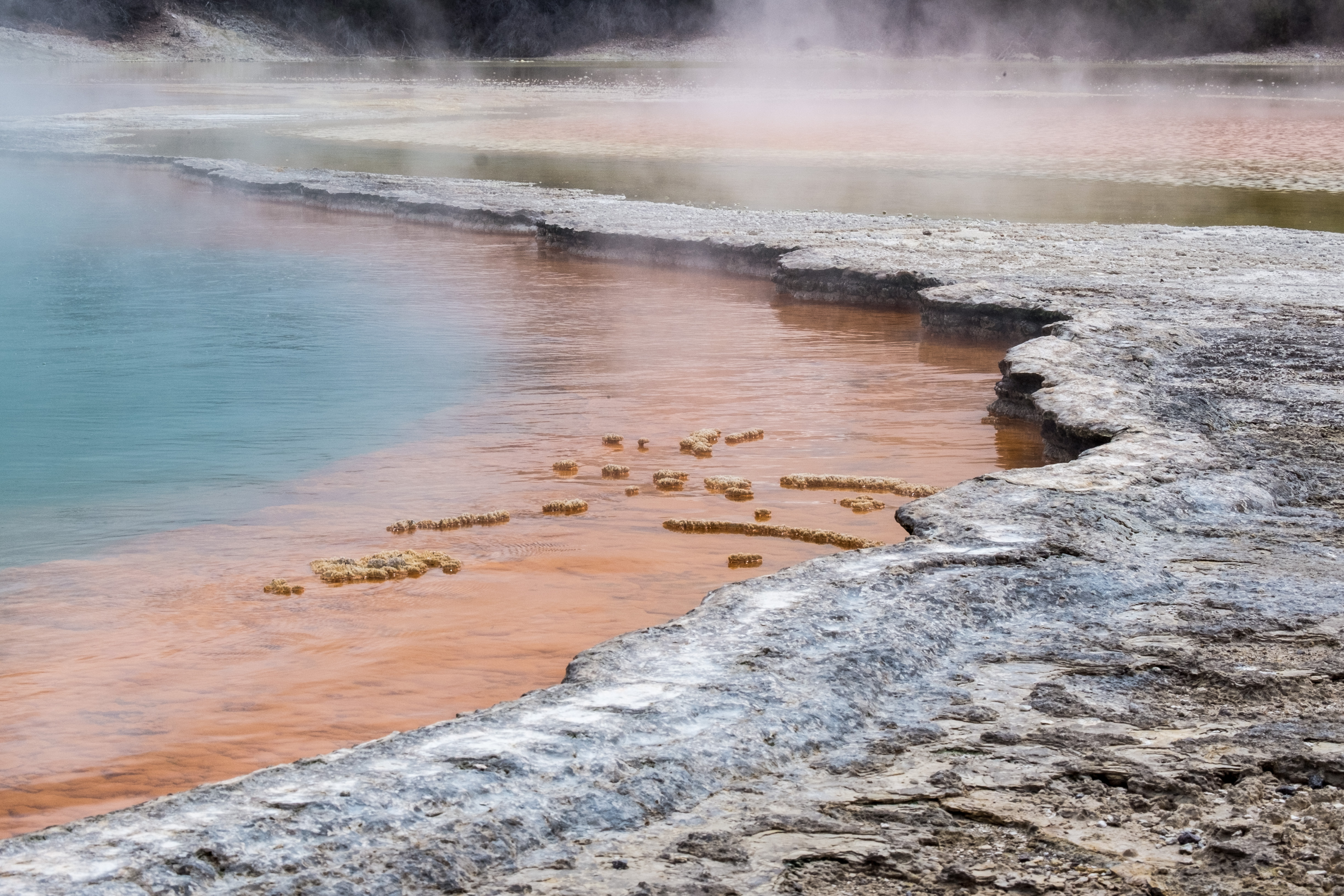 Sous le sol il y a plusieurs ruisseaux qui sont chauffés par du magma datant des précédentes éruptions volcaniques. L’eau est si chaude qu’en se frayant un chemin vers la surface elle absorbe tous les minéraux dans les roches et les ramène à la surface. Ces minéraux sont alors absorbés par le sol, ce qui donne toutes ces couleurs si surprenantes. La couleur orangée des bords de la « Champagne Pool » est donc due à une forte concentration de fer et d’antimoine alors que la couleur turquoise nous indique qu’il y a beaucoup de soufre et de sels ferreux.
