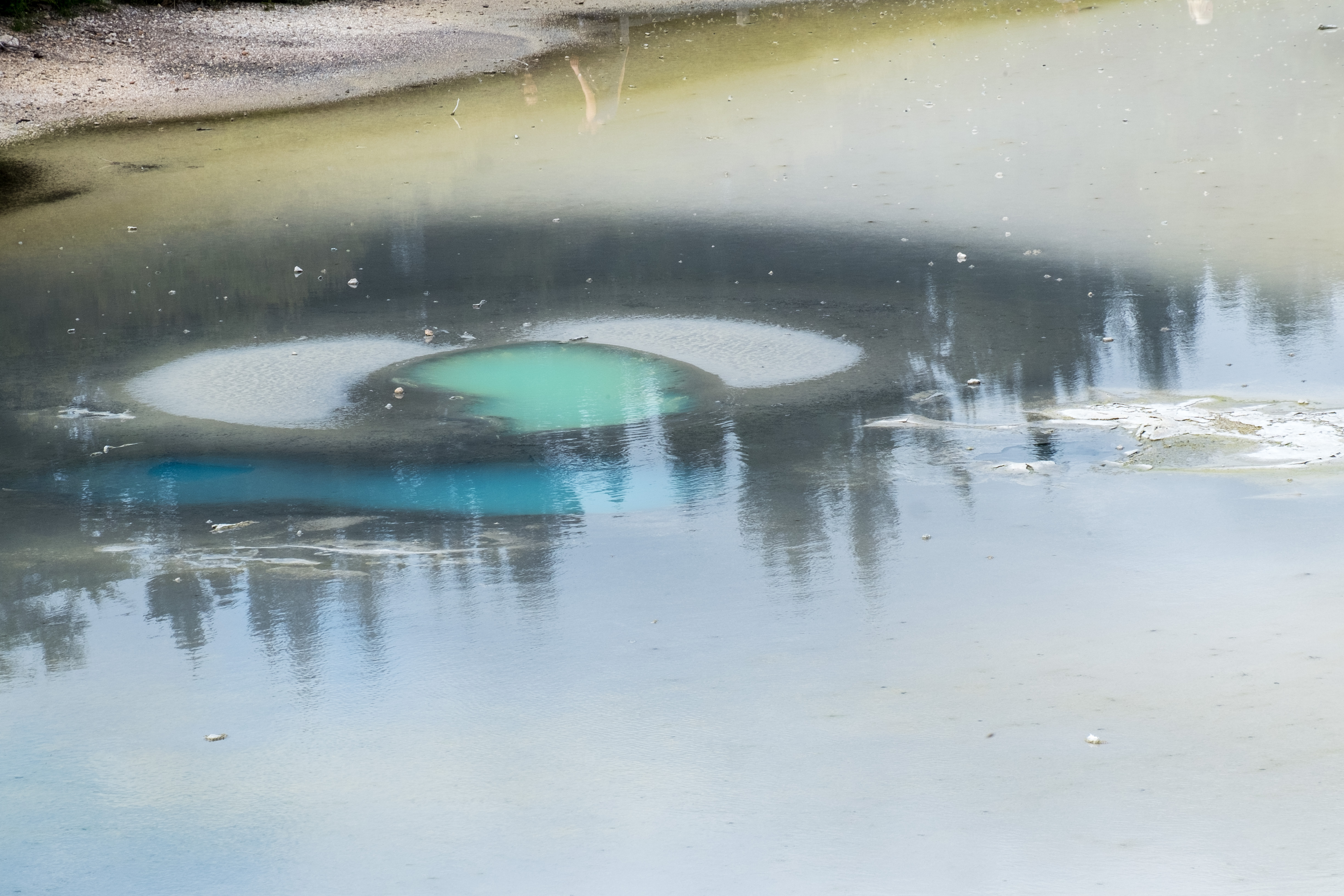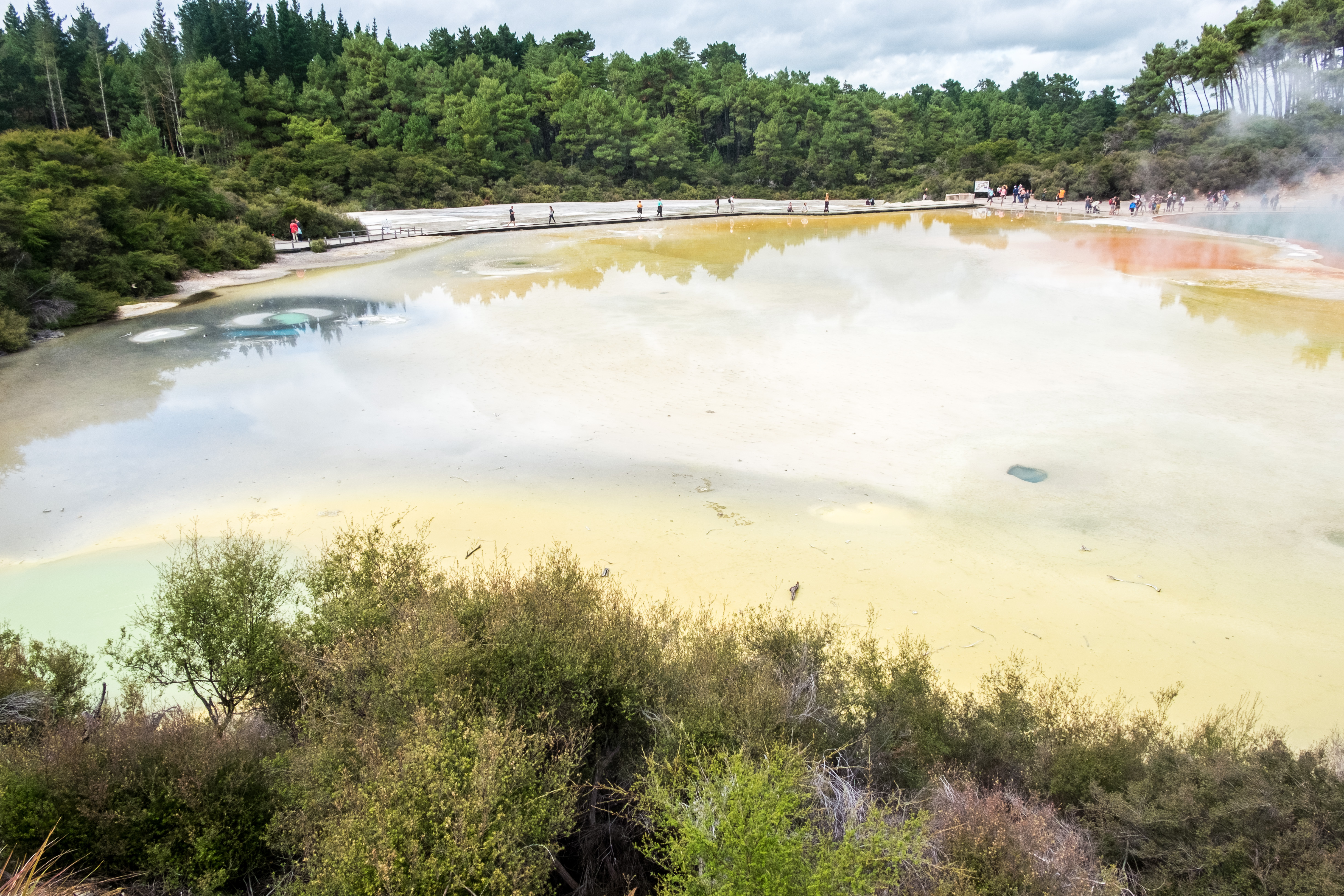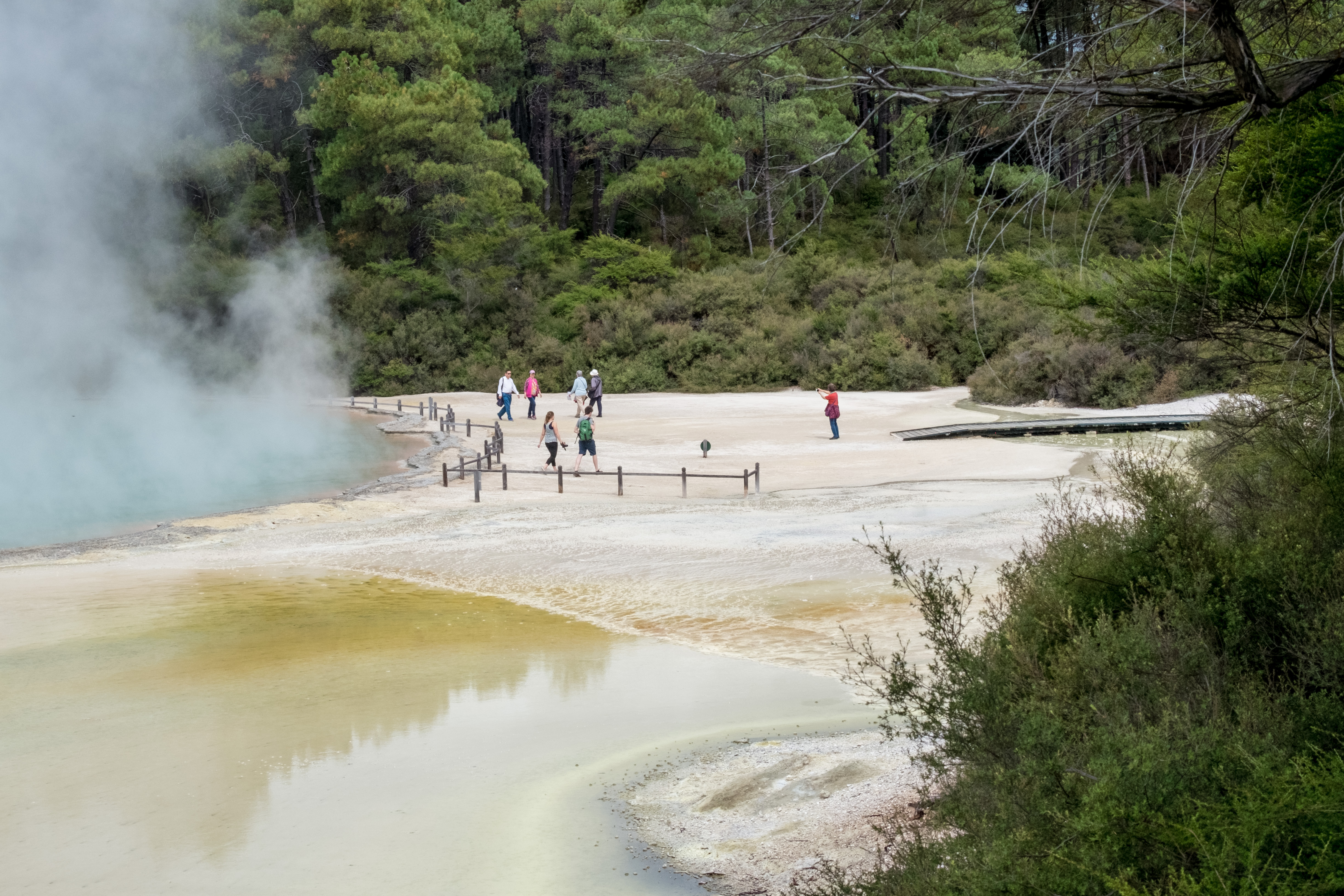 Sous le sol il y a plusieurs ruisseaux qui sont chauffés par du magma datant des précédentes éruptions volcaniques. L’eau est si chaude qu’en se frayant un chemin vers la surface elle absorbe tous les minéraux dans les roches et les ramène à la surface. Ces minéraux sont alors absorbés par le sol, ce qui donne toutes ces couleurs si surprenantes. La couleur orangée des bords de la « Champagne Pool » est donc due à une forte concentration de fer et d’antimoine alors que la couleur turquoise nous indique qu’il y a beaucoup de soufre et de sels ferreux.