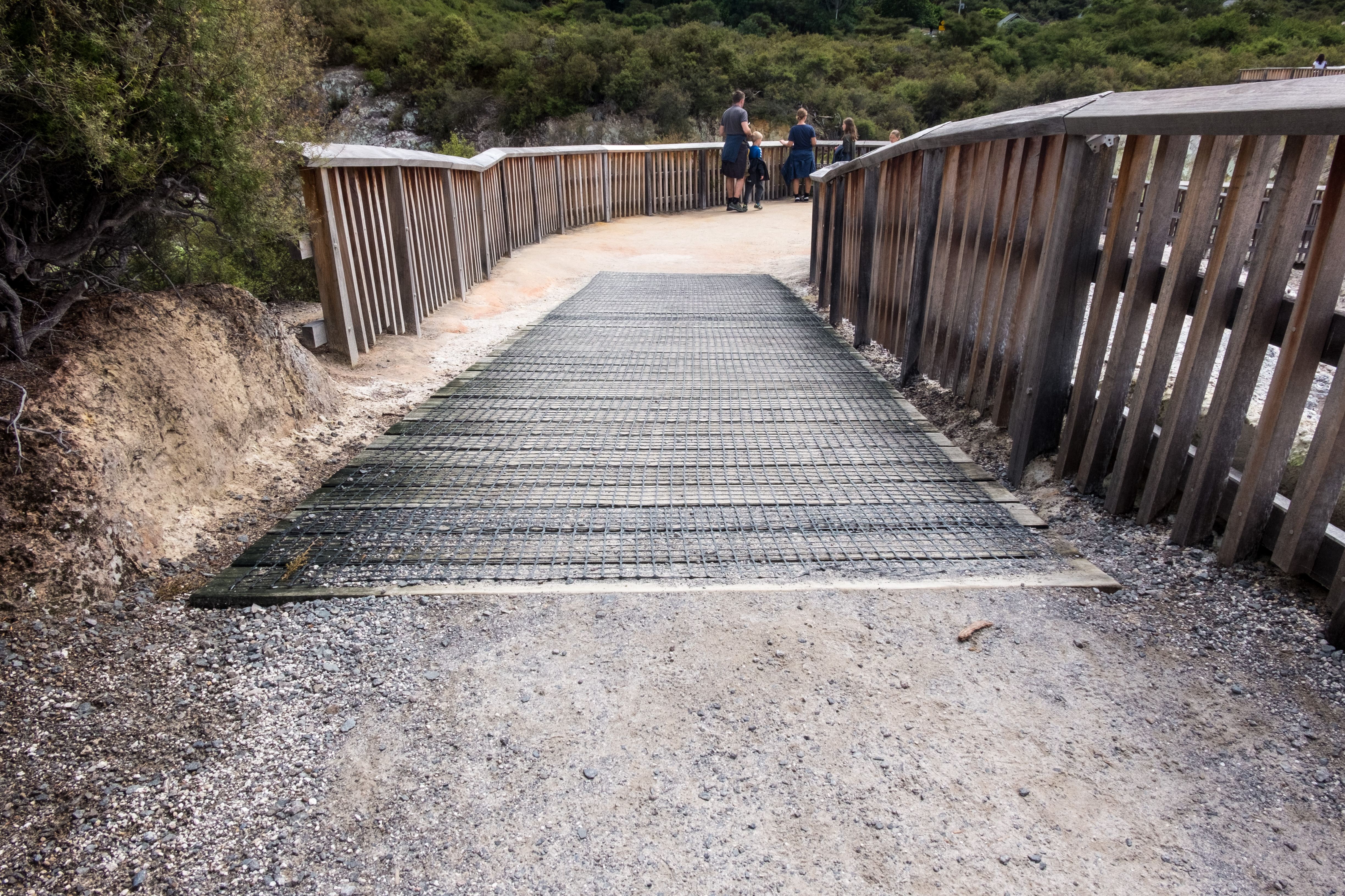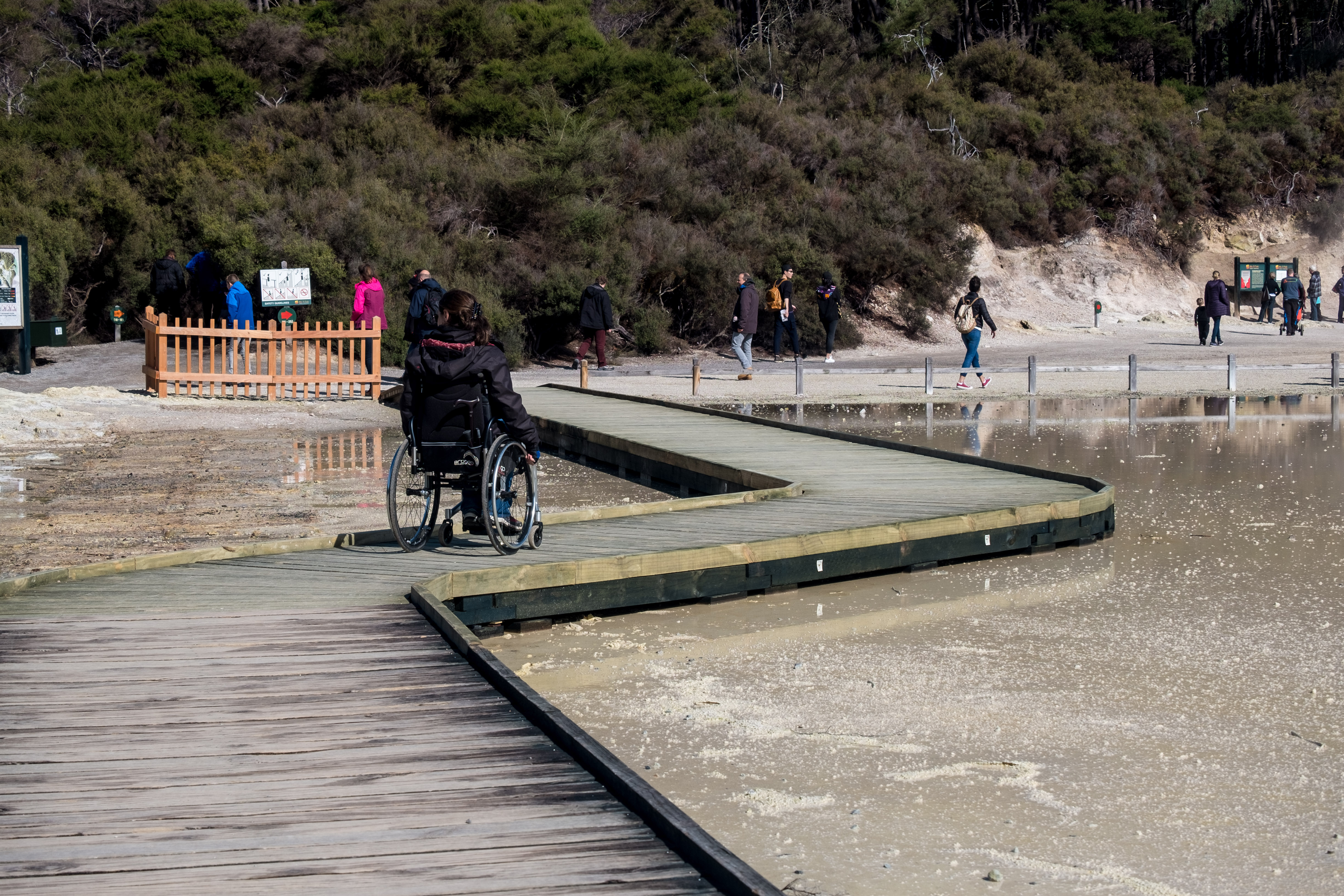 Pour les personnes en fauteuil roulant il est possible de visiter Wai-o-Tapu. Des places de stationnement réservées sont prévues devant l’entrée principale ainsi qu’au parking d’accès au Geyser Lady Knox. Il y a des toilettes adaptés à l’entrée du parc. Dans le parc il y a trois chemins à suivre si l’on veut tout voir. En fauteuil roulant seul le premier chemin est faisable. Il y a des escaliers sur les deux autres. Ceci dit le plus intéressant semble être sur le premier chemin et en plus l’entrée est gratuite pour les personnes handicapées. Aucune raison donc de se priver de ce show haut en couleurs ! Tout au long de la visite des plateformes de points de vues ont été aménagées pour pouvoir regarder sans gêner la circulation des personnes. Ces plateformes, ainsi que de nombreuses portions du chemin, sont bordées par des barrières en bois pour éviter les incidents du fait de l’instabilité du sol et de la chaleur de l’eau mais malheureusement leur hauteur force les personnes en fauteuil roulant à regarder entre les barreaux. A d’autres endroits les barrières sont plus basses ce qui permet une meilleure visibilité. La « Champagne Pool », par exemple, est parfaitement visible puisqu’elle est entourée de très basses barrières et que le sol est plat à cet endroit.