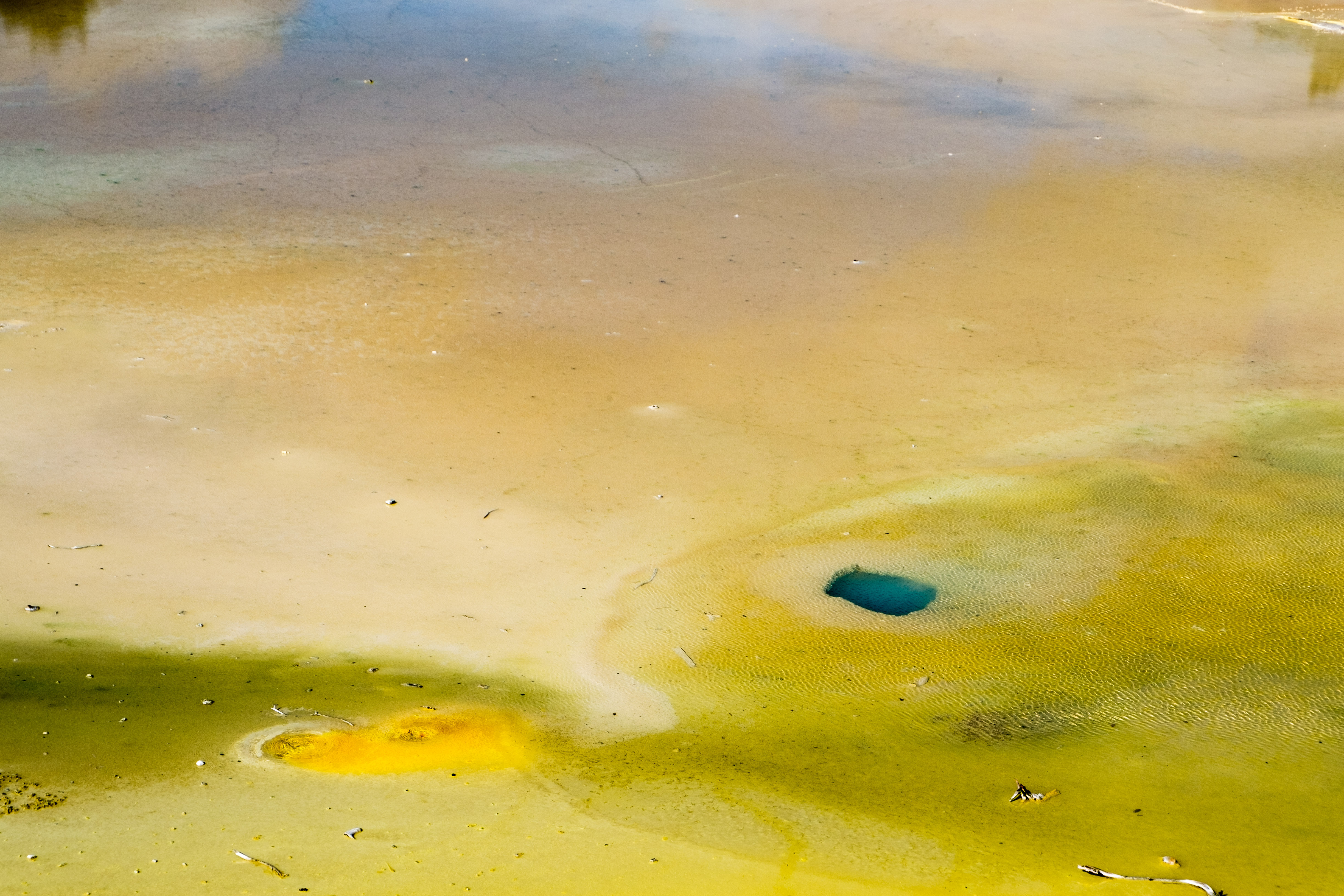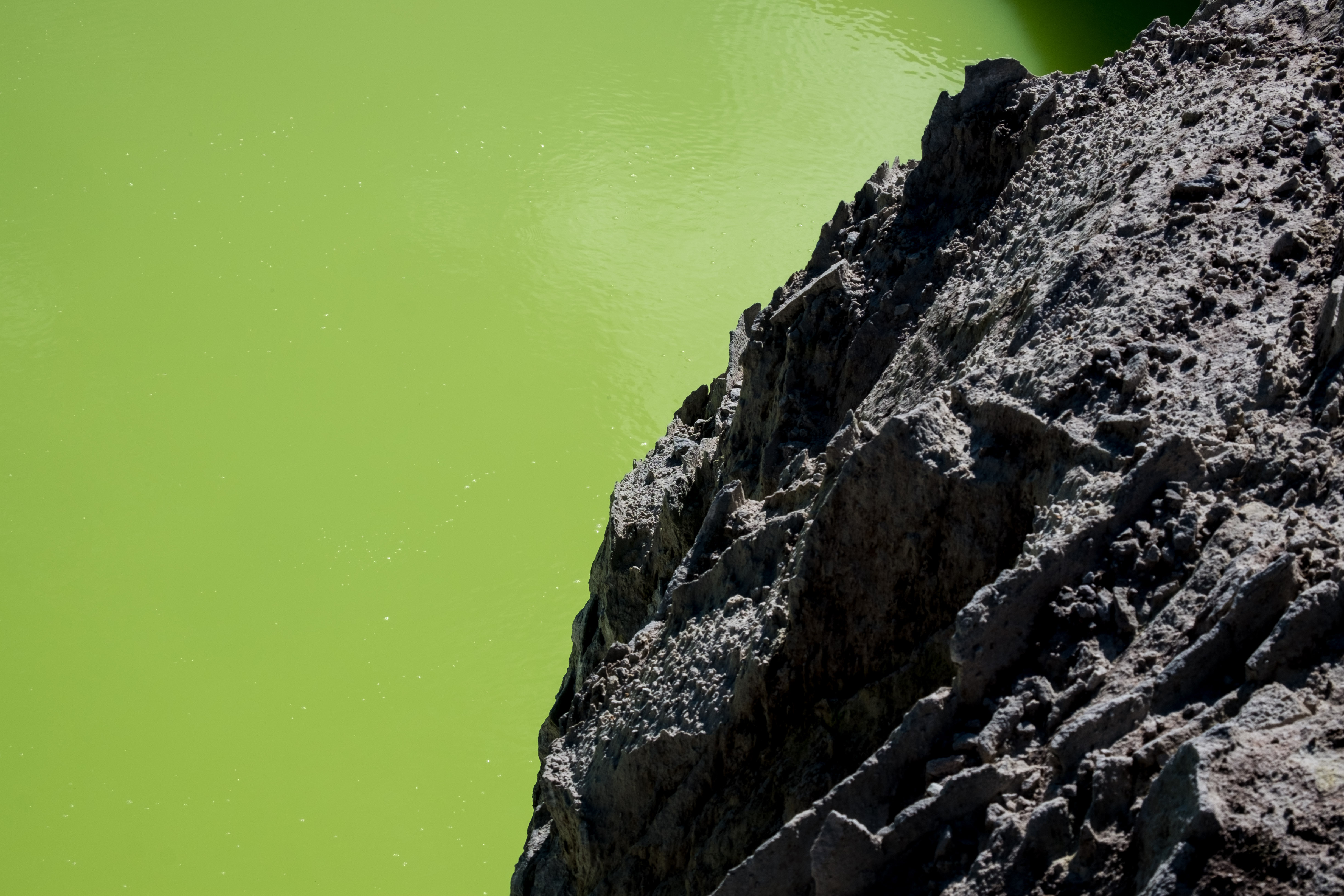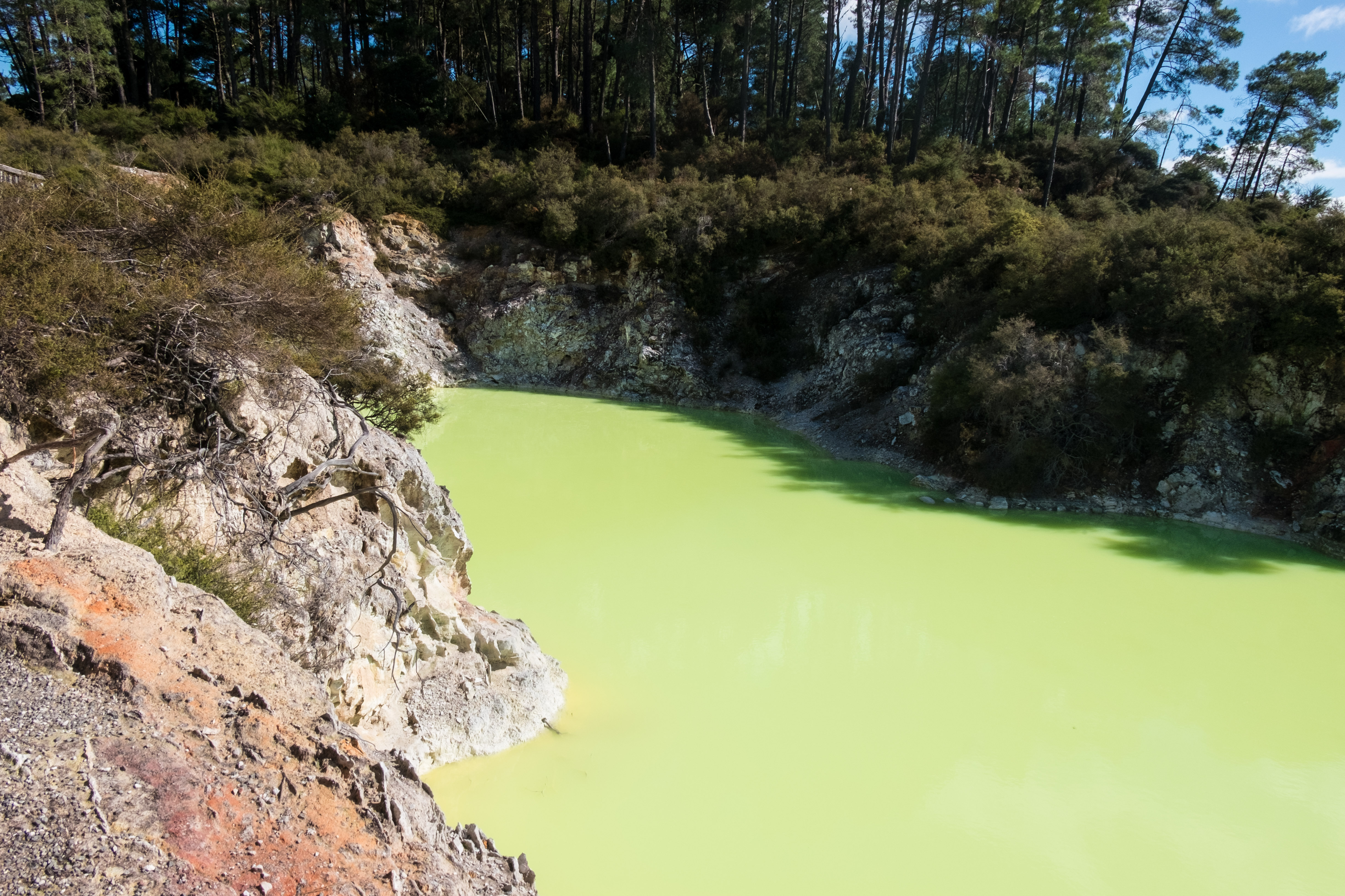 Je suis épatée par ces couleurs. C’est fou le résultat qu’on obtient avec de la chaleur et des minéraux. Après la « Champagne Pool » je me remets de mes découvertes et avance tranquillement vers la sortie. Je pensais avoir vu l’essentiel du parc mais quelques mètres plus loin m’attendait une autre surprise : un lac vert, très vert. Vert pomme. La couleur est complètement invraisemblable ! On ne devinerait même pas que c’est un lac si je prenais juste le vert en photo ! Ce lac est surnommé le « Bain du démon » et il porte bien son nom. Sa couleur ne donne vraiment pas envie de s’y baigner et c’est tant mieux, car s’il est si vert c’est parce qu’il est plein de soufre et de sels ferreux mélangés aux eaux de la « Champagne Pool ». En quelque sorte c’est une piscine d’acides.