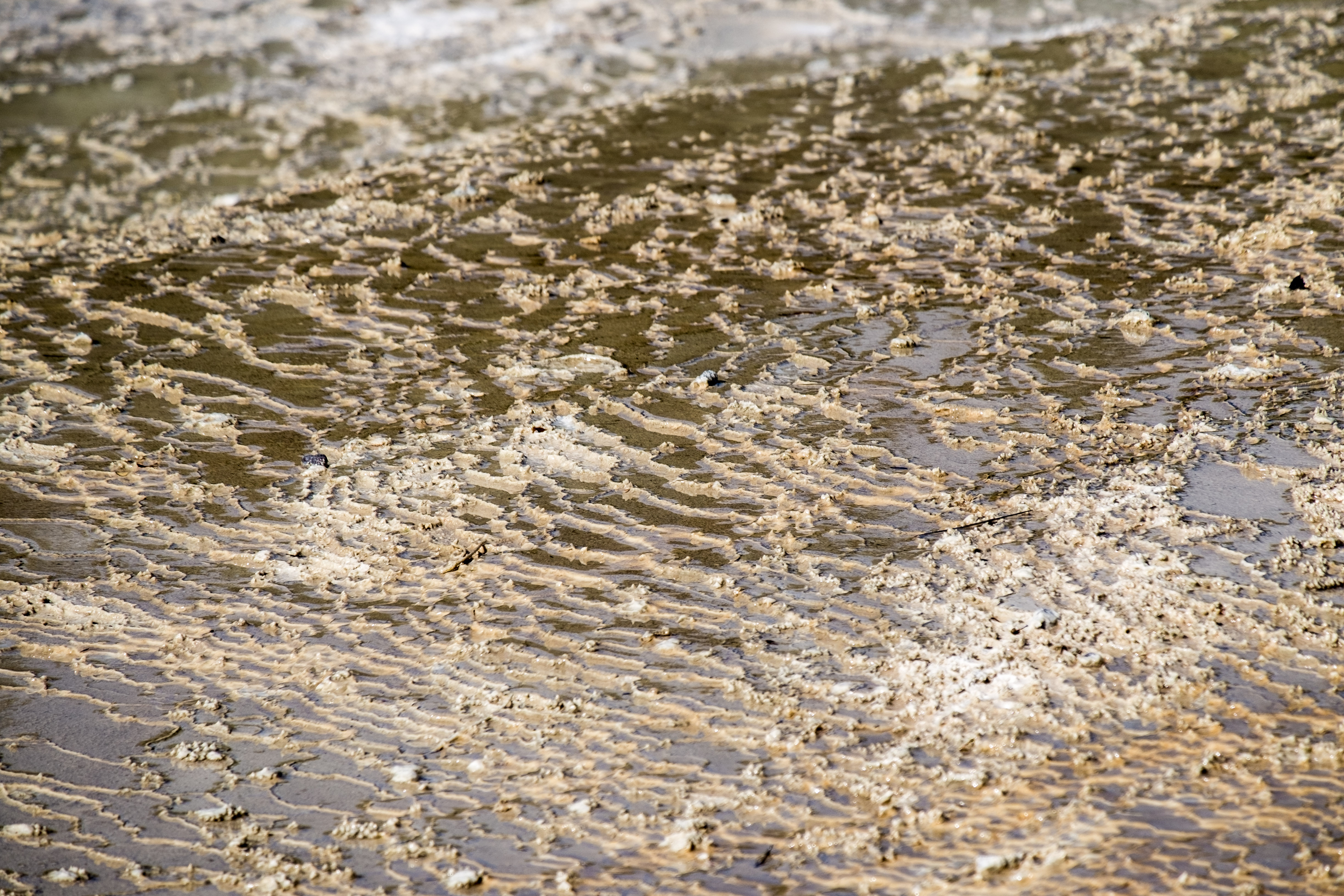 Après cela c’est l’heure d’aller découvrir le parc. Au programme : des cratères, des bassins de boues, pleins de couleurs et toujours cette odeur si particulière de souffre. Dès le début de la balade on découvre une importante cavité dans le sol avec des parois révélant une roche jaune et vert pales. Il y a d’autres cratères ainsi que des bassins à d’autres endroits du parc. Ces trous dans le sol se sont formés lorsque les cratères se sont écroulés tellement le sol est acide. Des vapeurs s’échappent de ces cavités et stagnent aussi au dessus des lacs. Ça sent le souffre à plein nez ! Ces vapeurs viennent même nous envelopper lorsque nous longeons et photographions la « Champagne Pool ». On aurait presque l’impression d’être passés dans un hammam.