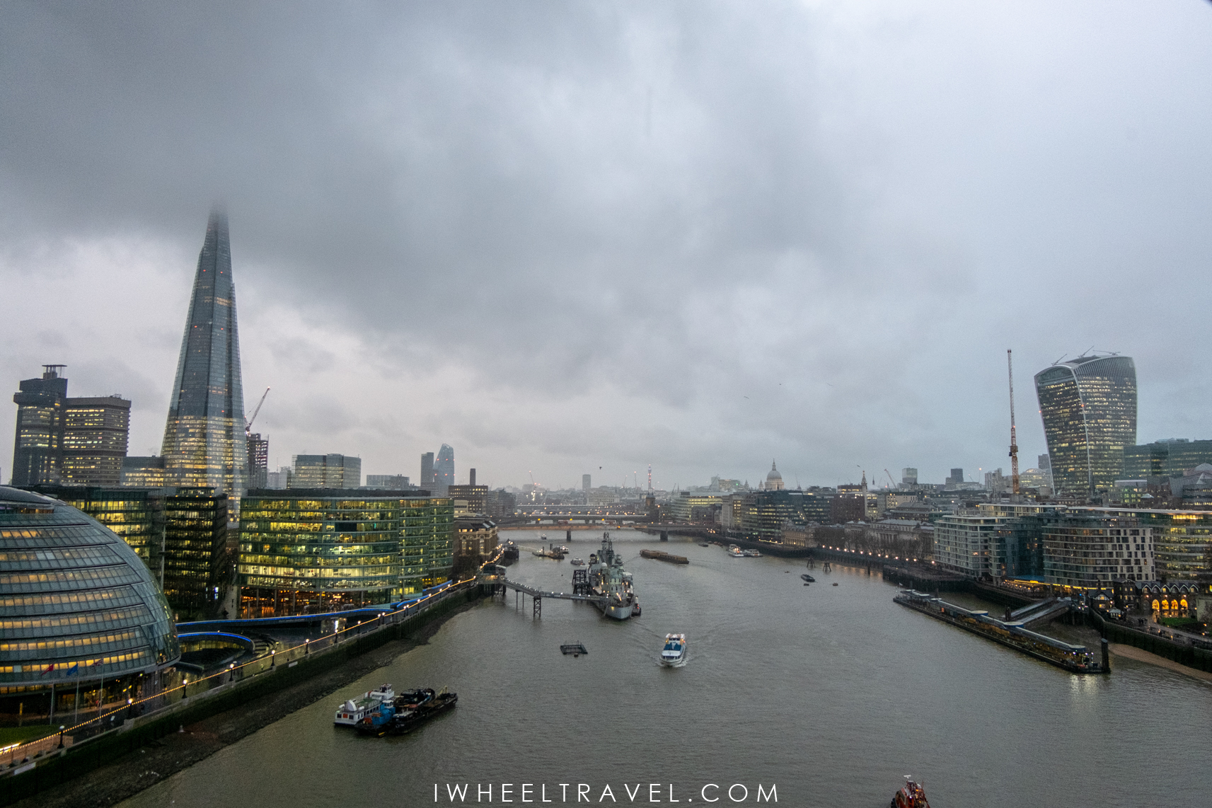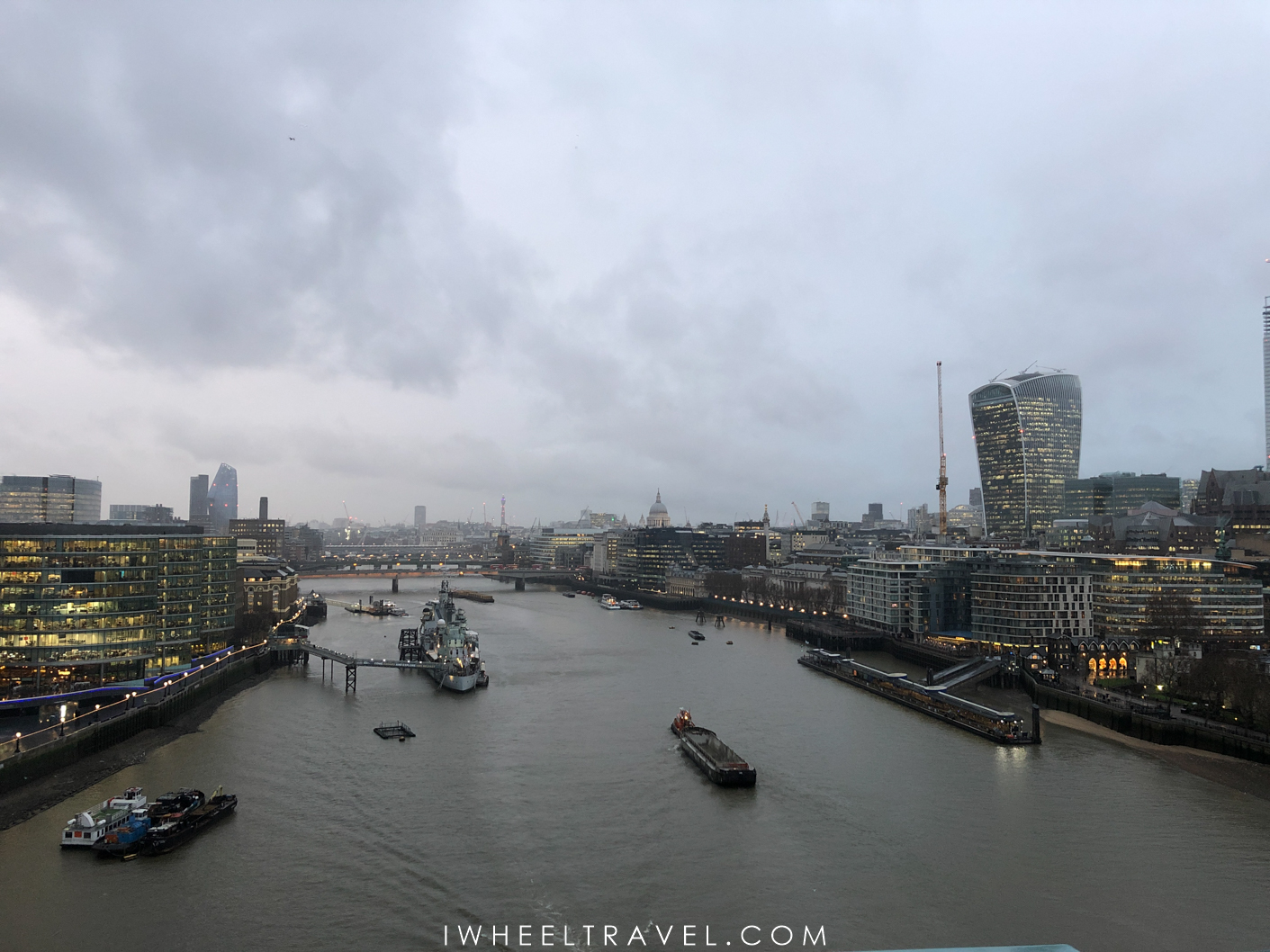 Après cette interlude gourmande, nous continuons notre balade le long de la Tamise et nous atteignons le célèbre Tower Bridge au moment même où il commence à pleuvoir. Nous rentrons donc rapidement dans l’édifice pour nous abriter. En effet, une fois en hauteur sur les passerelles de ce pont, nous sommes bien au chaud à l’intérieur à admirer la vue. Nous apprenons aussi de nombreuses choses sur le Tower Bridge et découvrons quelques anecdotes sur certains des ponts les plus connus au monde. J’ai d’ailleurs été surprise de découvrir que le Tower Bridge est fait d’acier et seulement recouvert de pierres. Apparemment il s’agissait d’une exigence pour bien se fondre dans le paysage londonien.
