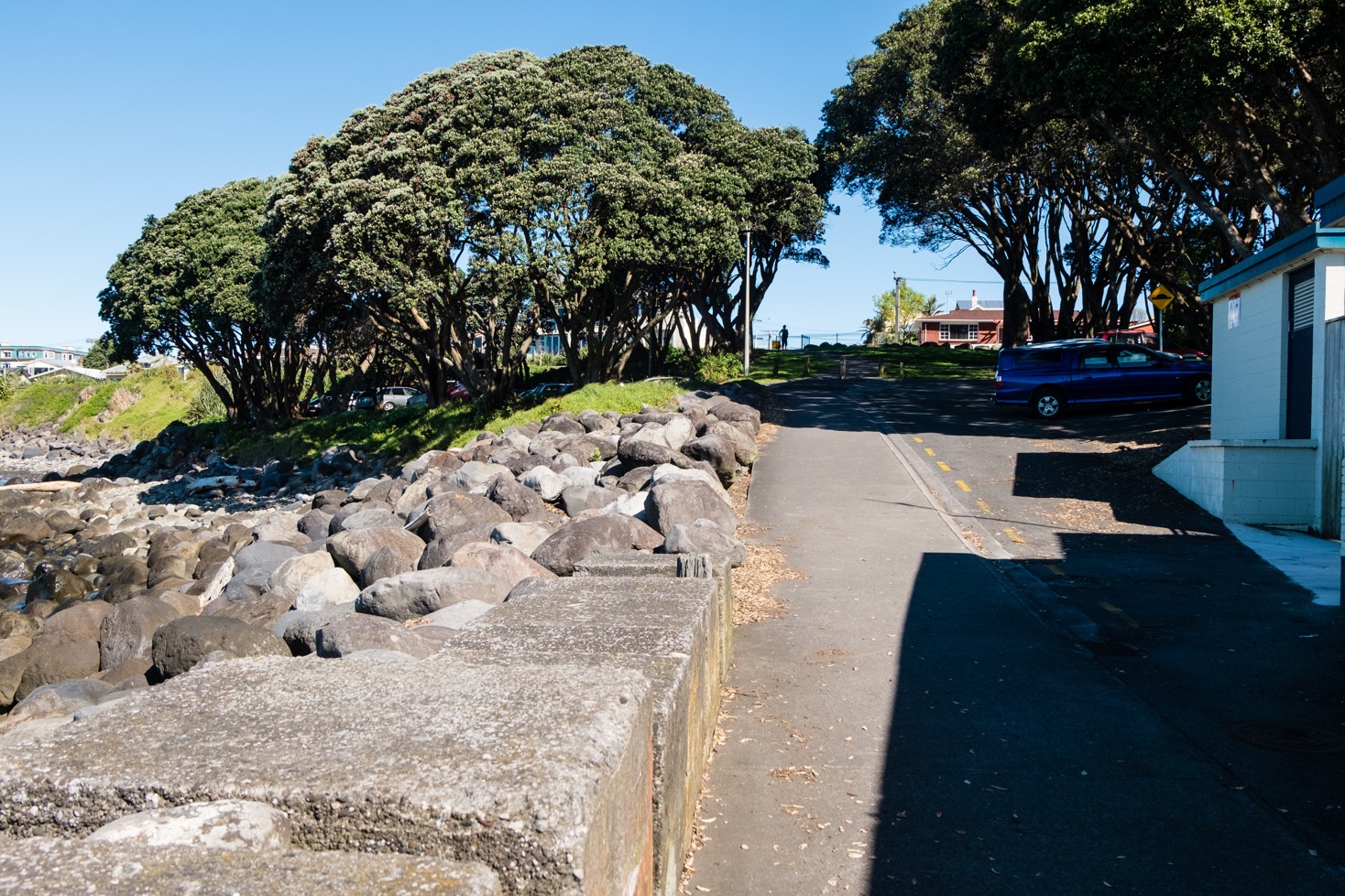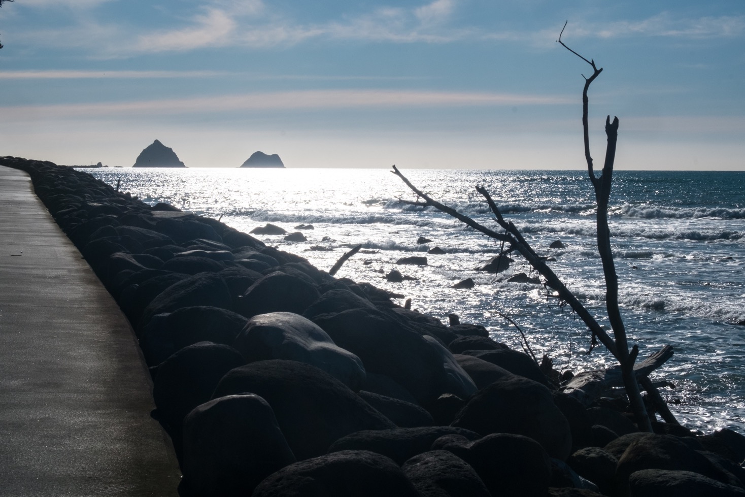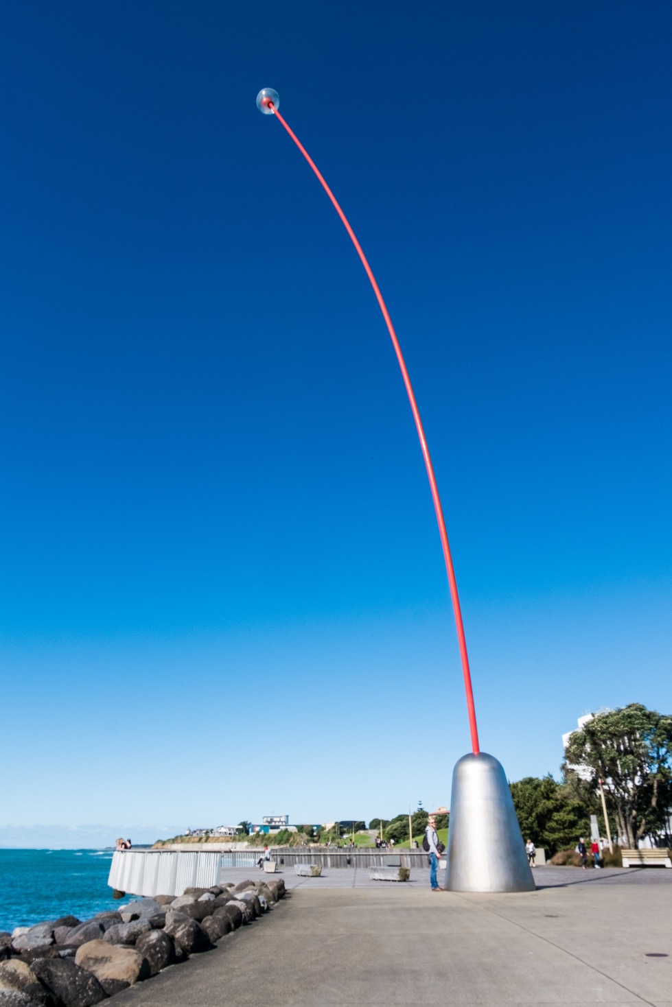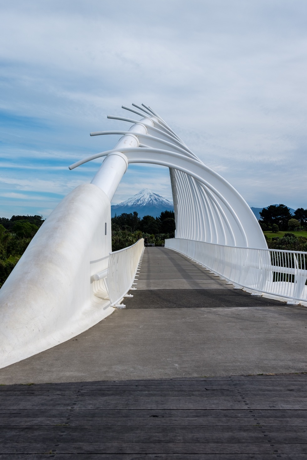 La coastal walkway vaut aussi de s’y attarder. Cette marche fait au total 12km mais il est parfaitement possible de n’en faire qu’une partie. Elle est bordée par le littoral sur toute sa longueur et par une voie ferrée sur la première partie (Ngamotu Beach to Kawaroa Beach). Il faut donc traverser les rails quelques fois mais en contrepartie il est possible d’admirer le sommet du mont Taraniki. On peut aussi voir des petites criques de sable noir ainsi que le Paritutu Rock et les Sugar Loaf Islands, des petites formations volcaniques émergent de la mer. Nous avons aussi découvert un peu plus loin le Wind Wand, une sculpture un peu bizarre qui ressemble à une énorme perche rouge de 48 mètres de haut ! Si vous avez le courage de faire quelques kilomètres de plus vous pourrez aussi voir le Te Rewa Rewa Bridge, célèbre pour son architecture surprenante et son alignement parfait sur le mont Taranaki. Il est aussi possible de s’y rendre en voiture.