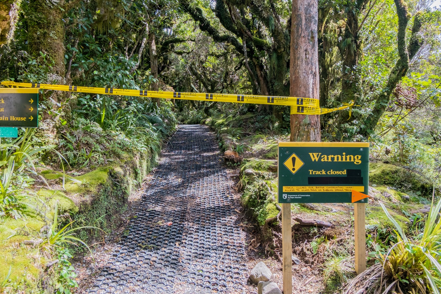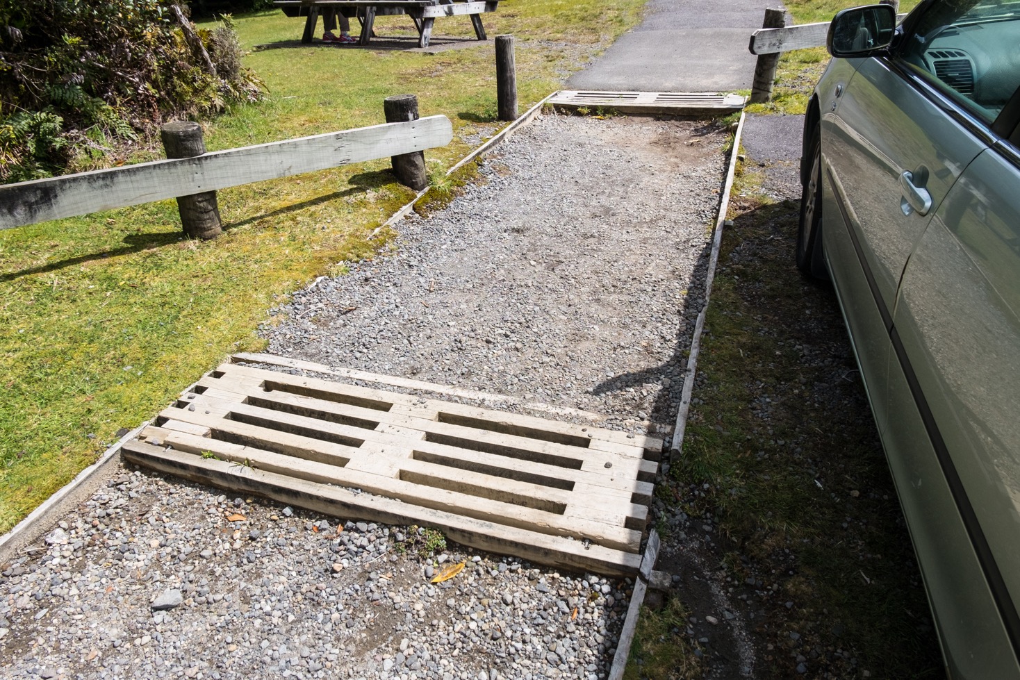 Il y a trois points d’accès pour se rendre sur le mont Taranaki et rejoindre les différentes walks : North Egmont, East Egmont et Dawson Falls. Il y a des centres d’information du Department of Conservation à North Egmont et à Dawson Falls. Après avoir feuilleté quelques dépliants sur les différentes randonnées à faire nous avons opté pour Dawson Falls. Nous voulions faire la Wilkies Pool Loop Track qui est censée être accessible pour une personne en fauteuil roulant avec l’aide d’une autre personne. En réalité ce n’est pas vraiment accessible. Dès le départ il y a deux petites marches à franchir avant même d’être sur le chemin de la walk. Le sol est recouvert d’un espèce de quadrillage qui est censé faciliter la promenade en fauteuil roulant mais qui génère beaucoup de vibrations. Il est donc difficile de progresser, d’autant plus que ça monte bien. La meilleure solution semble être d’avancer sur les roues arrières avec l’aide d’une autre personne. C’est ce que nous avons fait pendant environ 200 mètres avant d’être stoppés. A cet endroit le chemin se sépare en deux avec la partie censément accessible sur la gauche et celle non accessible sur la droite. Et comme en ce moment la voie de gauche est fermée car il y a des travaux nous avons fait demi-tour.