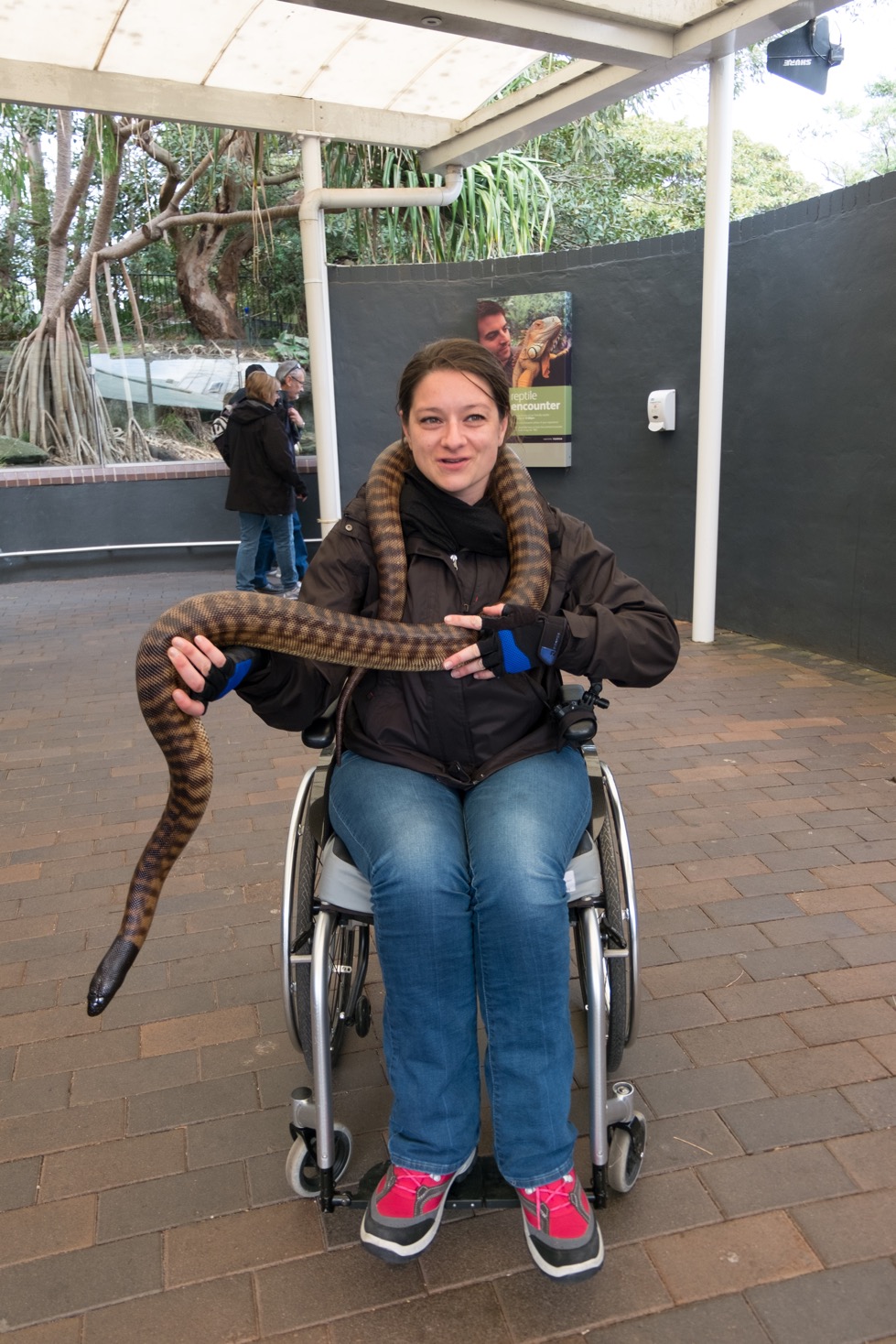 Pour notre première journée, nous choisissons de visiter le zoo de Sydney car il parait qu’il est vraiment sympa et qu’il permet d’avoir une vue magnifique sur le port de Sydney. Nous n’avons pas été déçus ! C’est un des plus beaux zoos que nous avons eu l’occasion d’arpenter. Nous passons d’un enclos à l’autre presque sans s’en apercevoir car nous nous baladons dans un environnement très naturel. Nous admirons beaucoup d’animaux de tous les continents et, évidemment, d’Australie. Nous découvrons avec plaisir de très belles espèces d’oiseaux ainsi, bien sûr, que les célèbres koalas, kangourous et wallabys. De nombreux divertissements sont prévus pour les visiteurs. Si nous avons manqué les spectacles de rapaces et de phoques, nous avons quand même pu caresser un wallaby et j’ai porté un gros serpent ! Surprise : au détour d’un enclos, nous avons même été attaqués par une autruche en liberté. Menaçante, elle a continué à nous poursuivre jusqu’à l’intervention d’un gardien ! Plus de peur que de mal, nous repartons indemnes.
